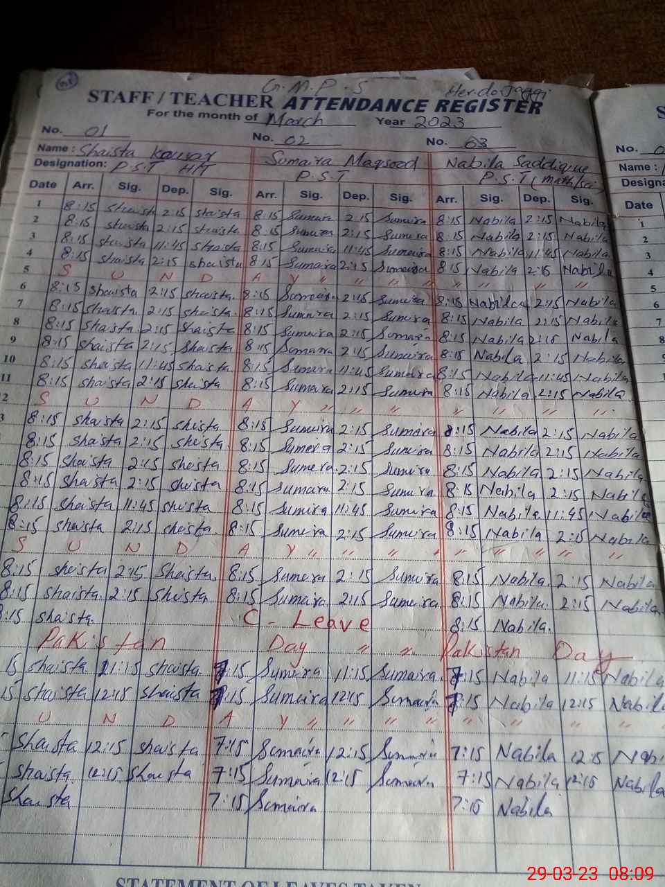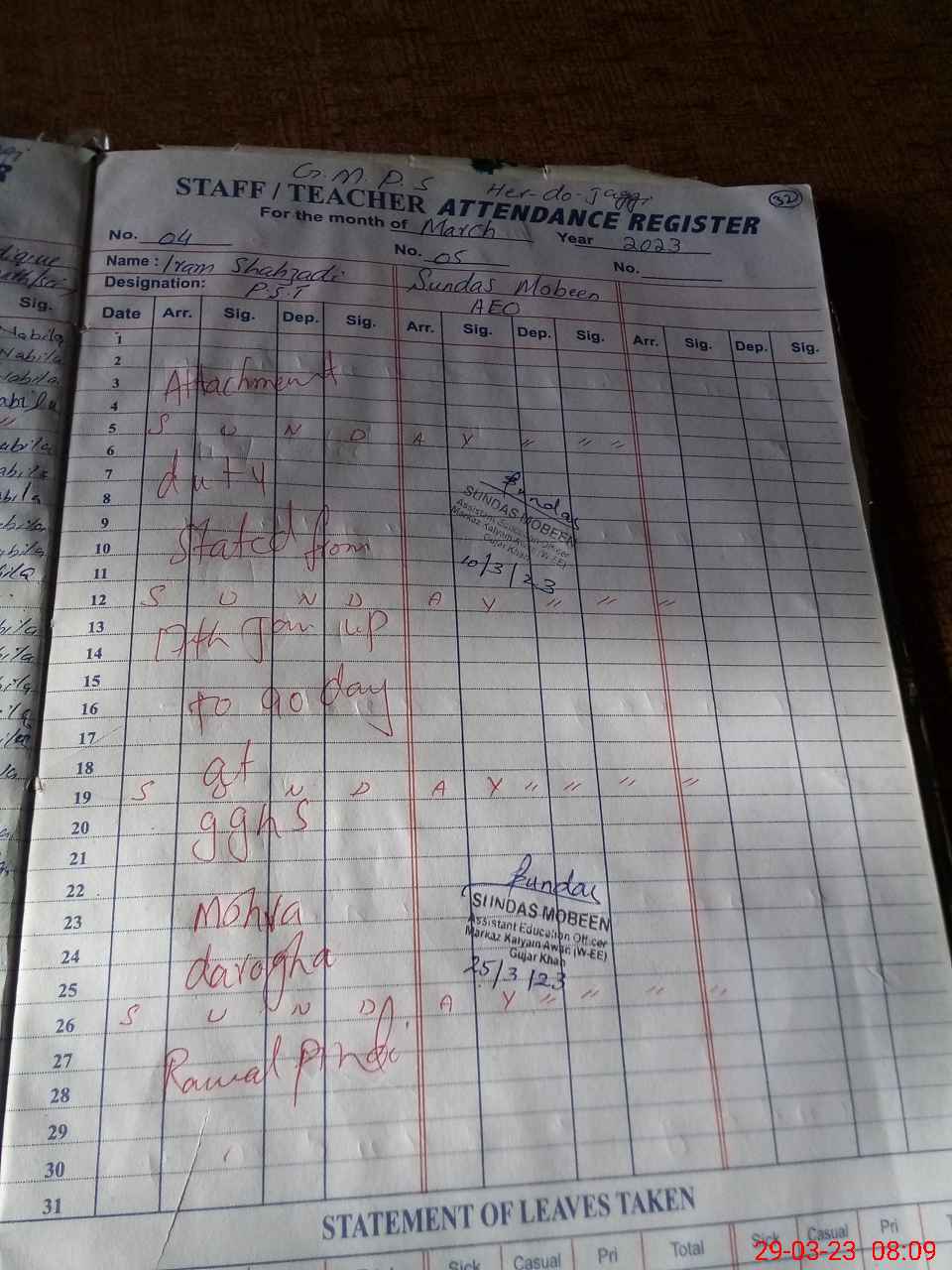 | Remarks (Use Separate Page if Required): Teacher Iram Shehzadi attached to GHS Mohra Darogha Students are exam off | |||||