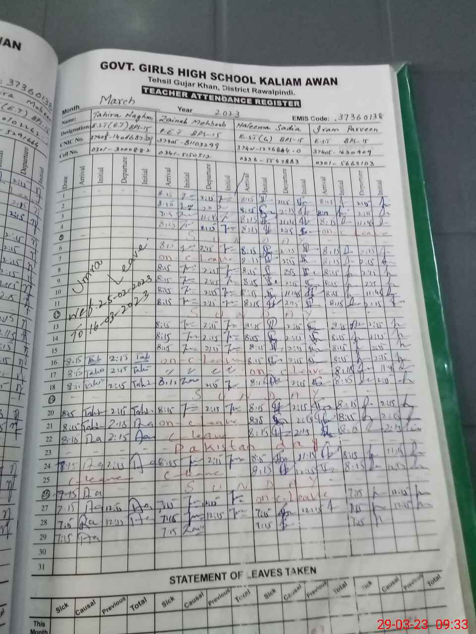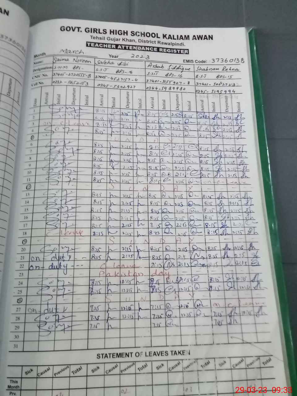 | Remarks (Use Separate Page if Required): Teacher Ifra Nasir is attached to Qaid Academy Islamabad Students are exam off | |||||