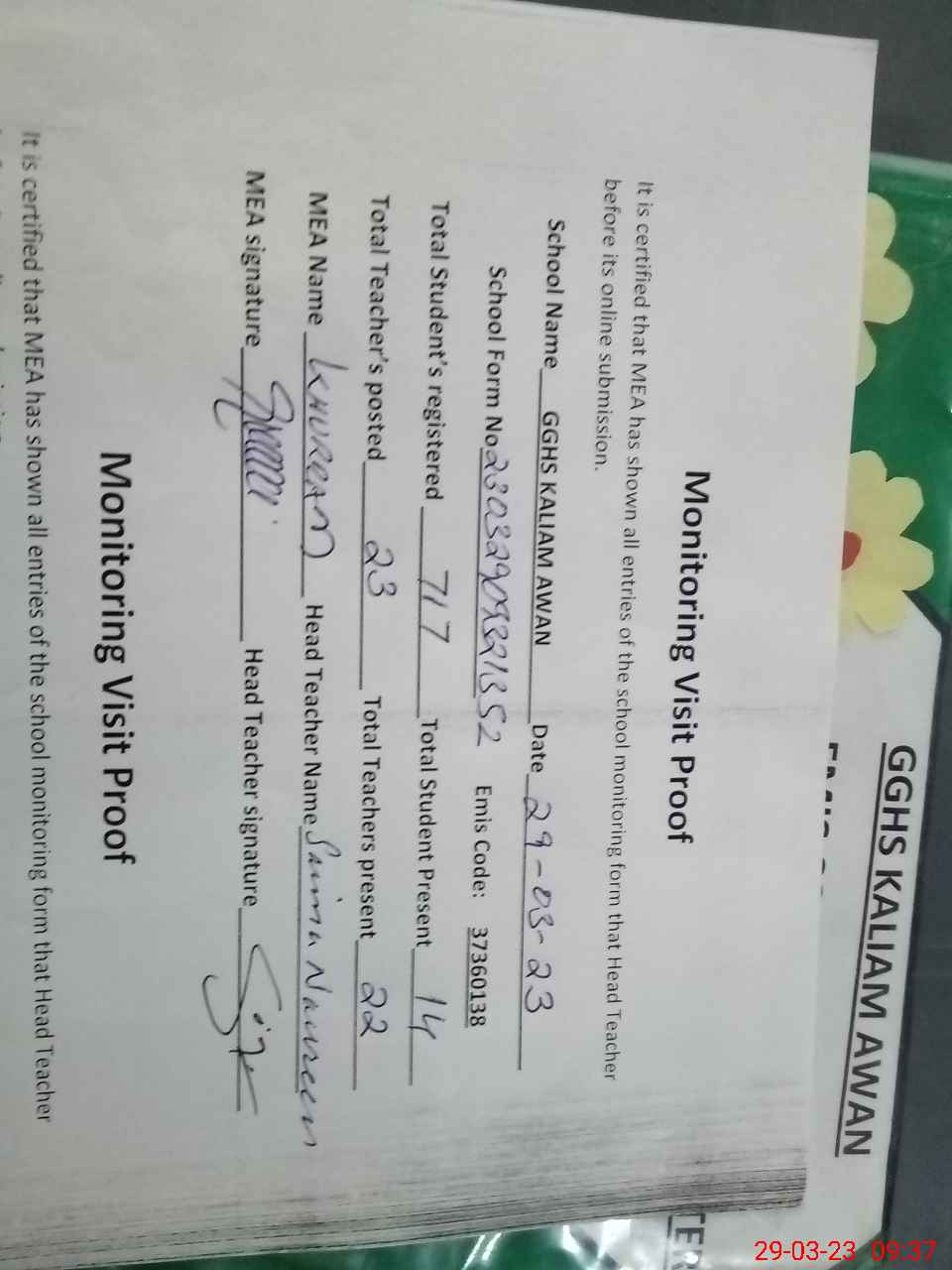| Attendance Register | Head Teacher | MEA with School | Visit Proof |