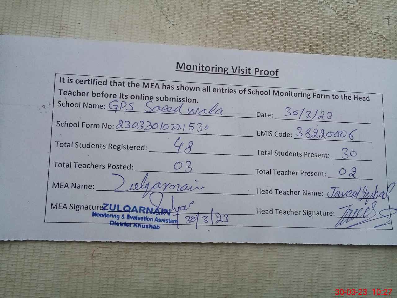 | Attendance Register | Head Teacher | MEA with School | Visit Proof |