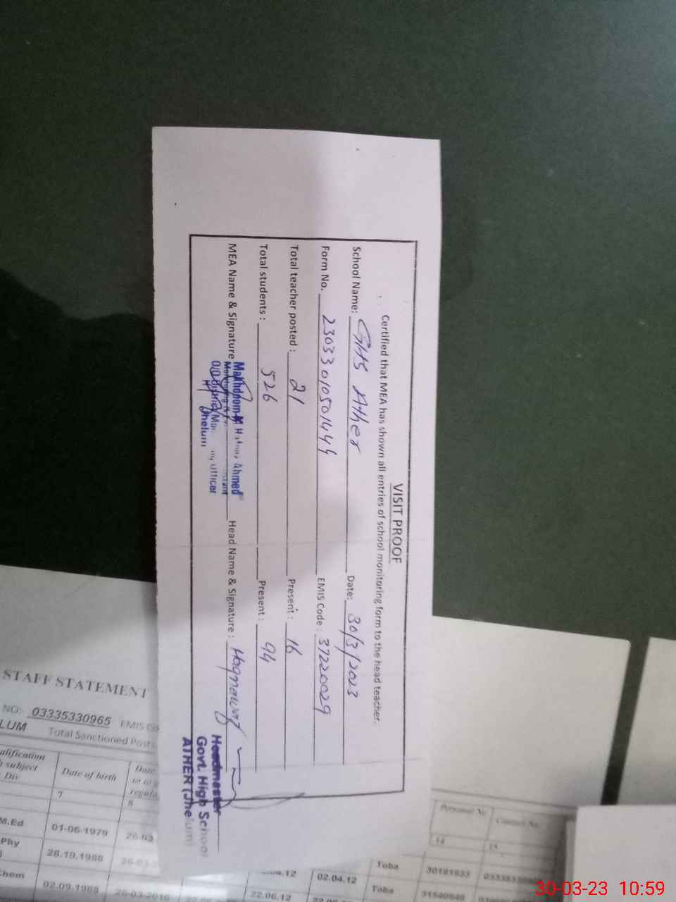 | Attendance Register | Head Teacher | MEA with School | Visit Proof |