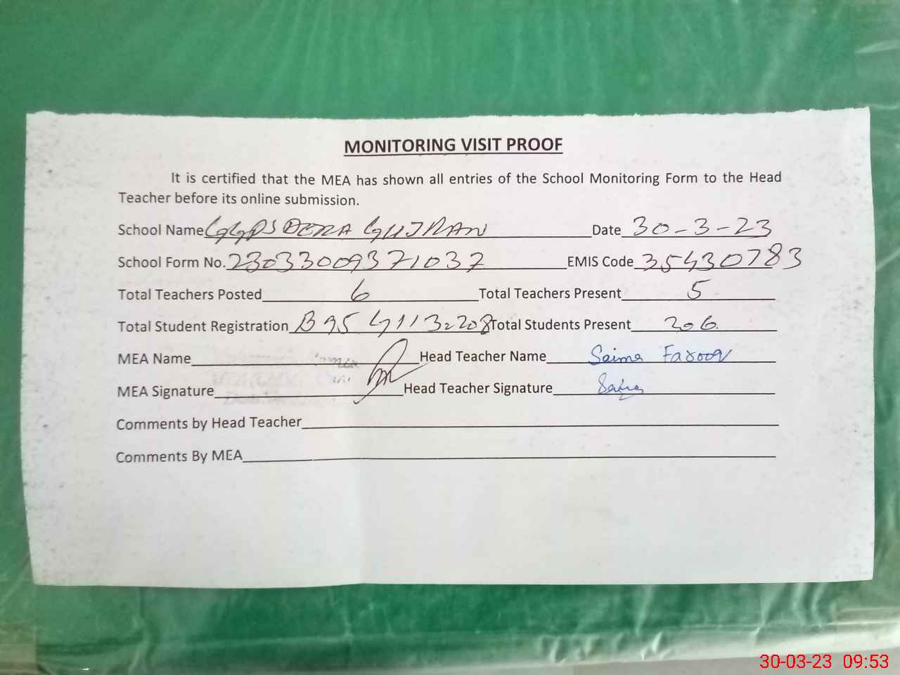 | Attendance Register | Head Teacher | MEA with School | Visit Proof |
