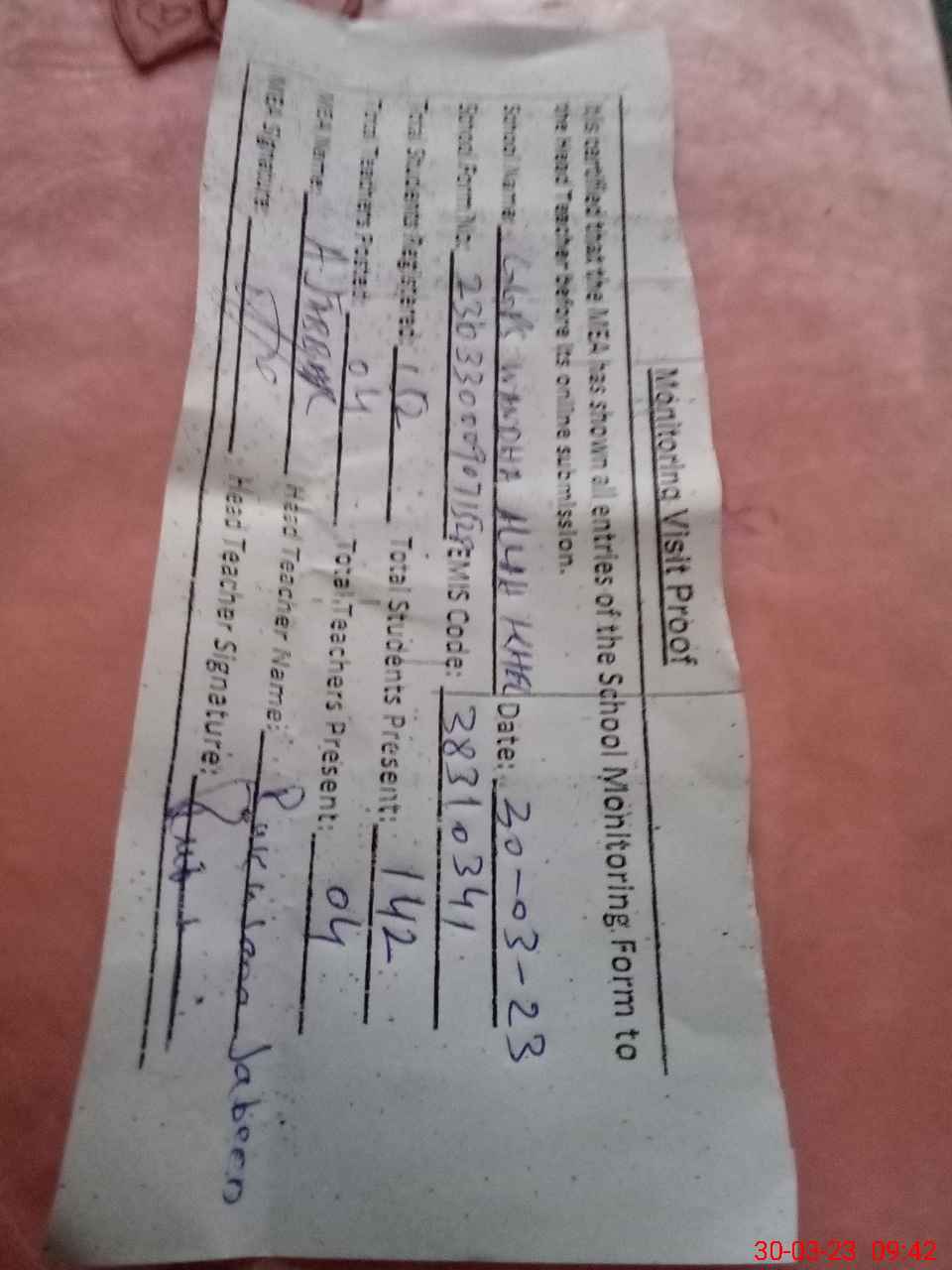 | Attendance Register | Head Teacher | MEA with School | Visit Proof |