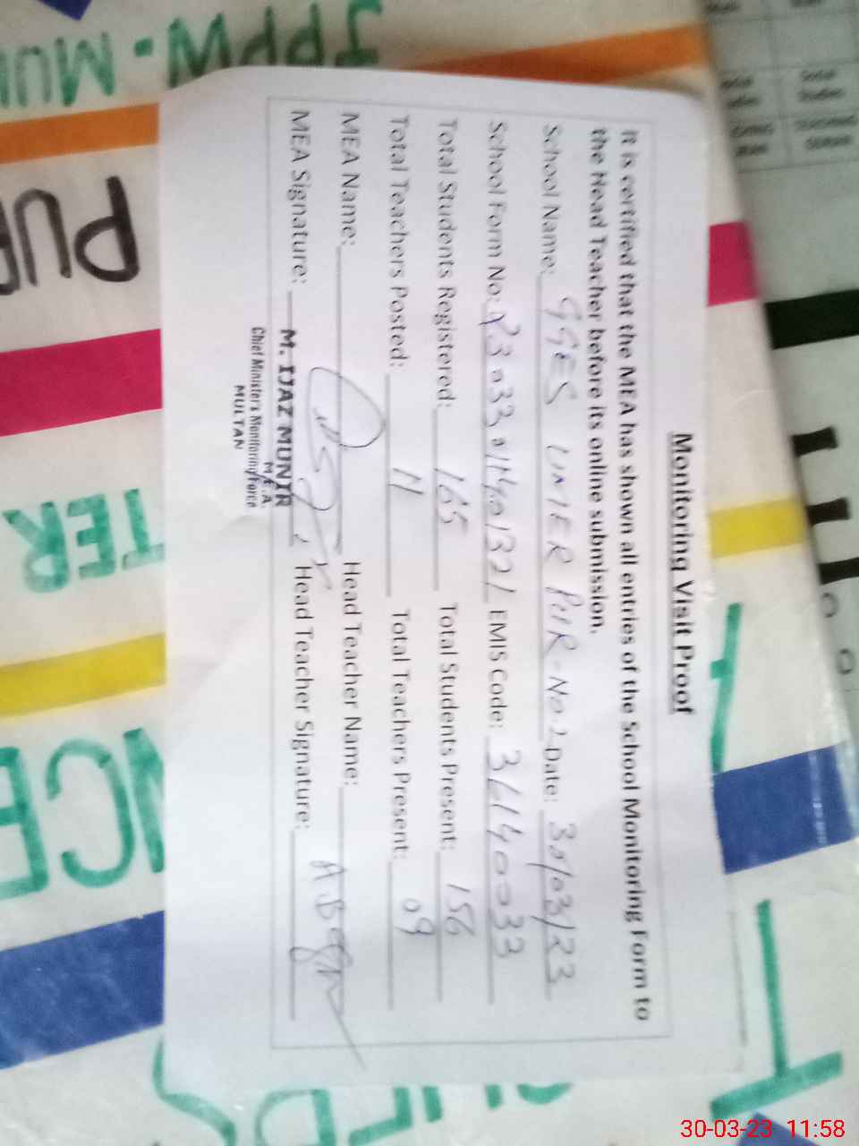| Attendance Register | Head Teacher | MEA with School | Visit Proof |