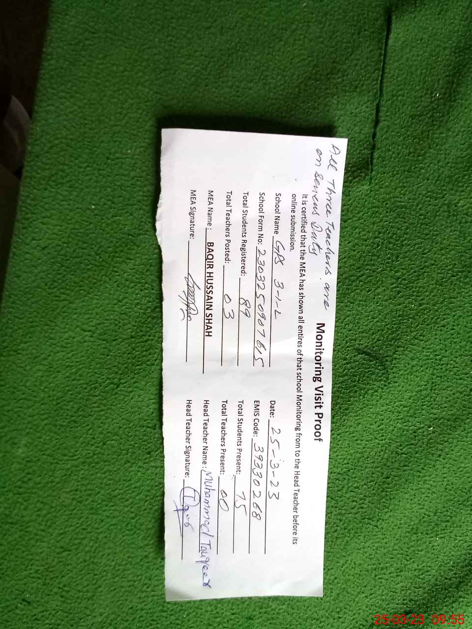 | Attendance Register | Head Teacher | MEA with School | Visit Proof |