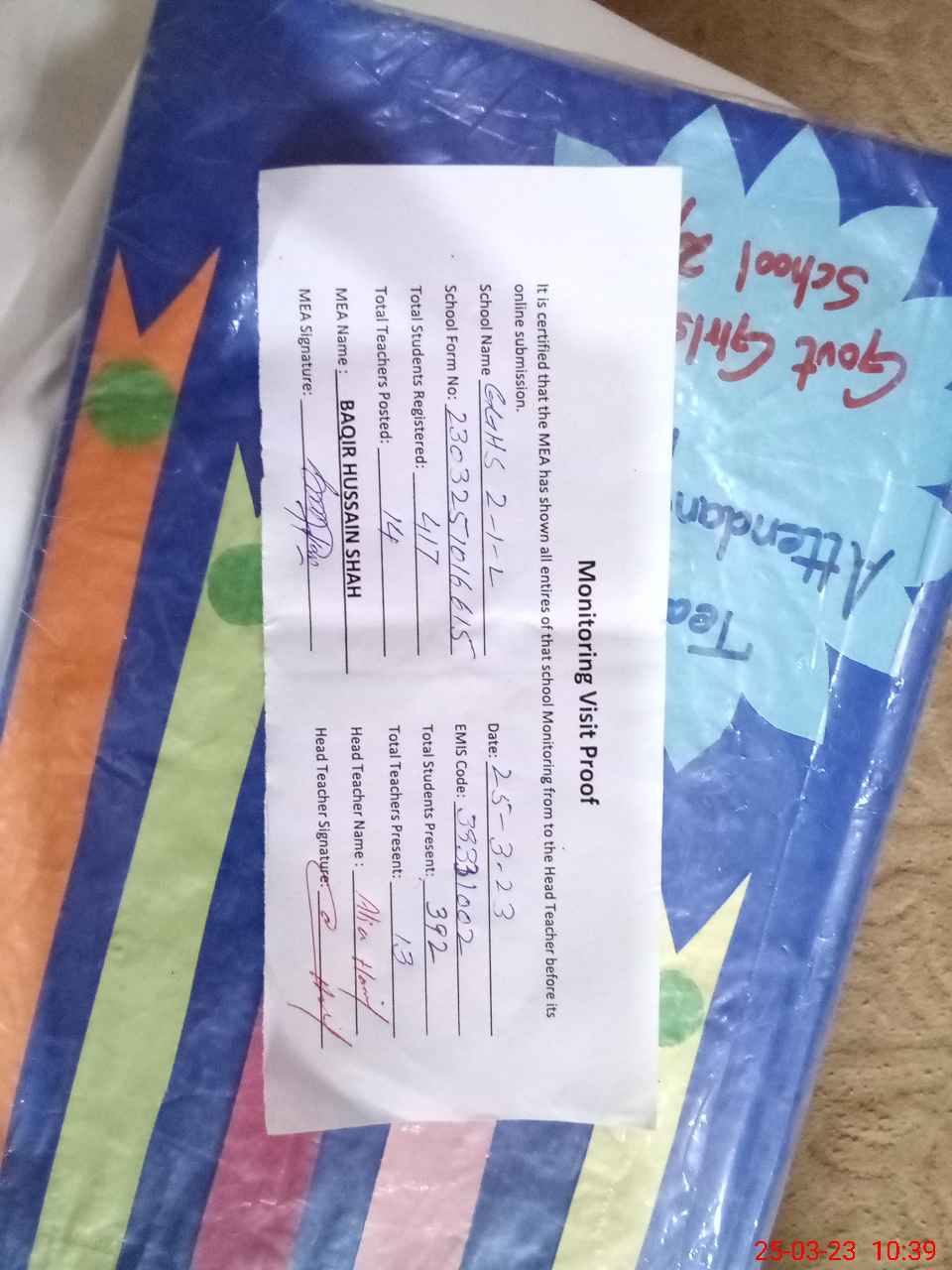 | Attendance Register | Head Teacher | MEA with School | Visit Proof |