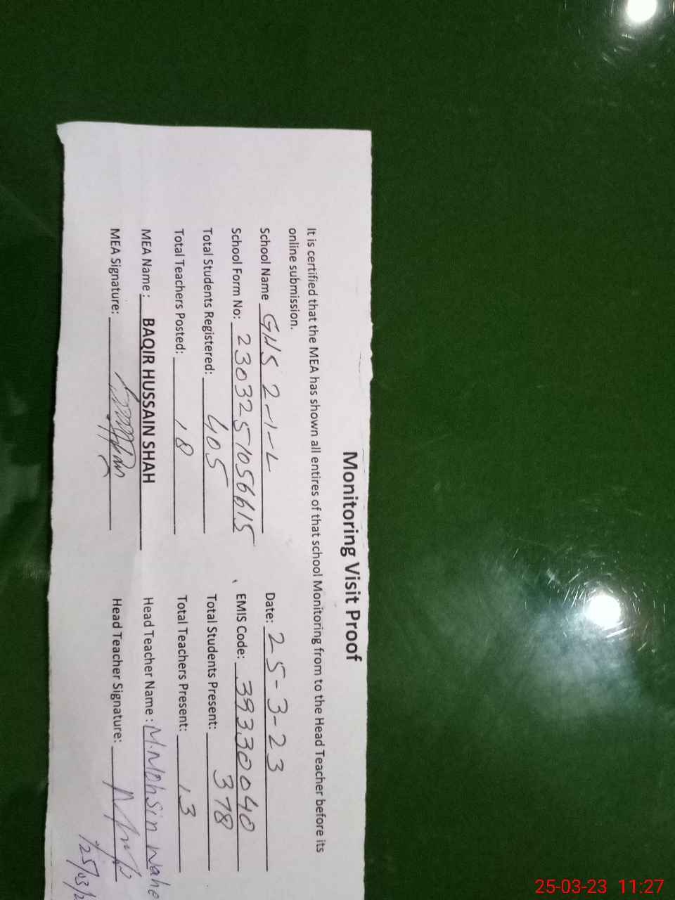 | Attendance Register | Head Teacher | MEA with School | Visit Proof |