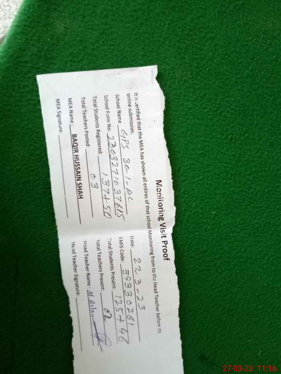 | Attendance Register | Head Teacher | MEA with School | Visit Proof |
