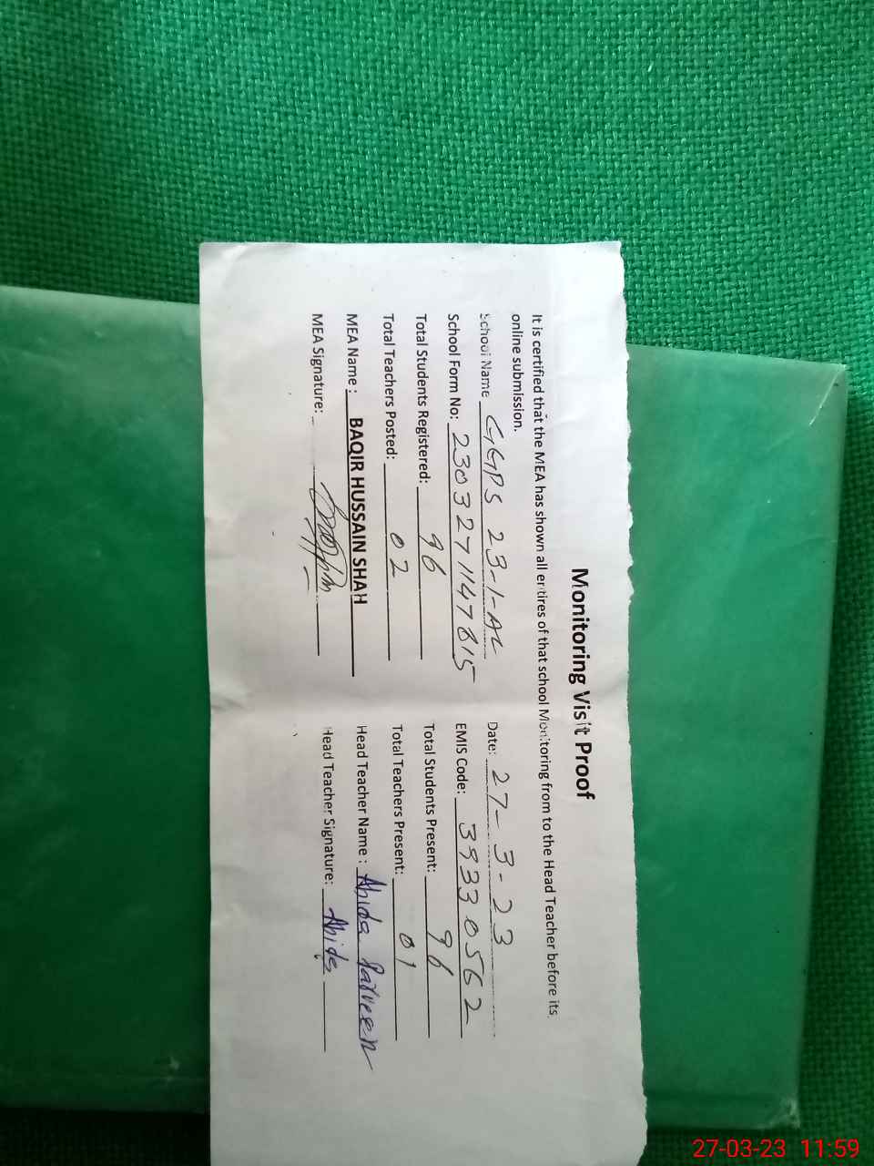 | Attendance Register | Head Teacher | MEA with School | Visit Proof |