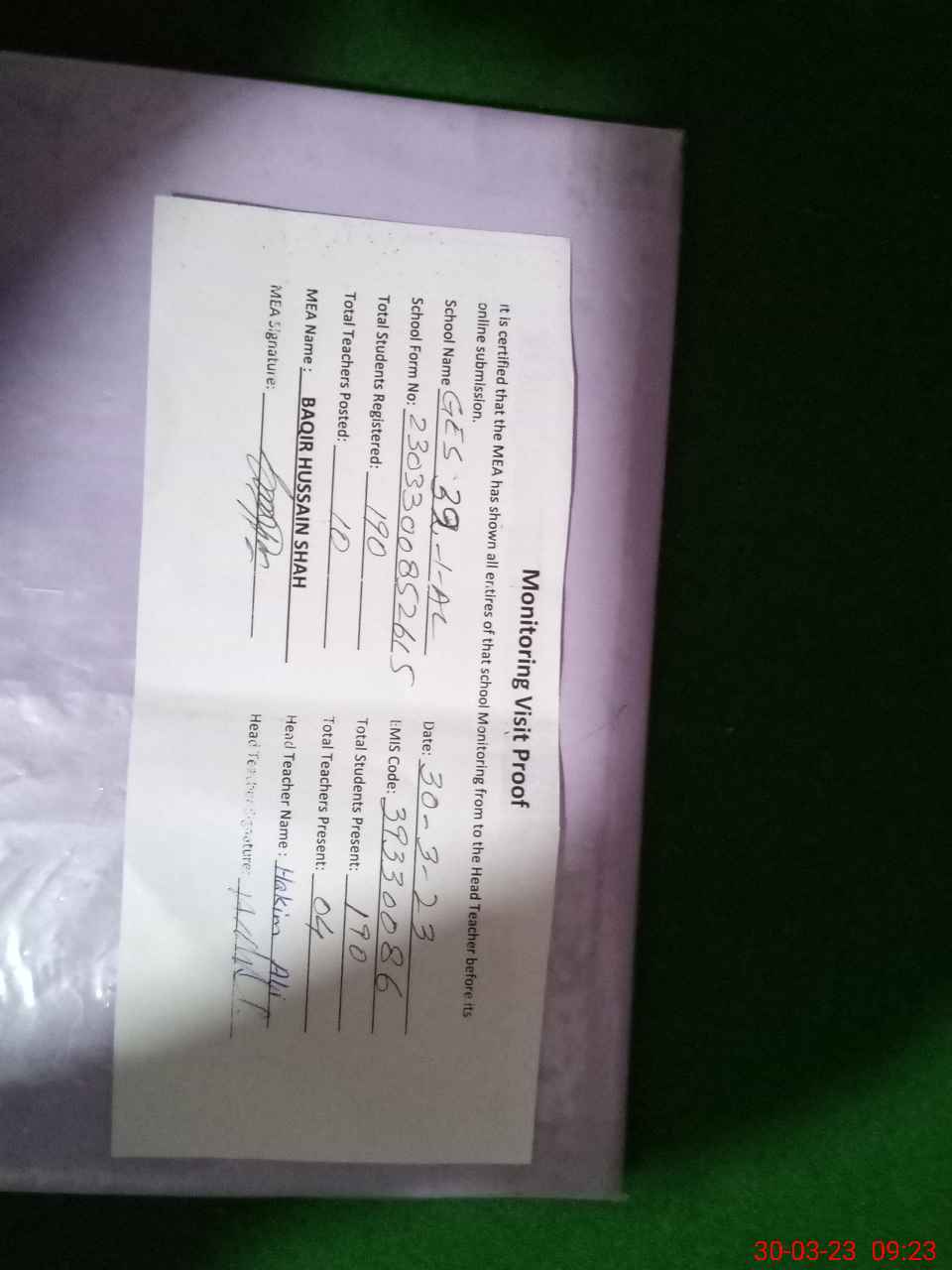 | Attendance Register | Head Teacher | MEA with School | Visit Proof |