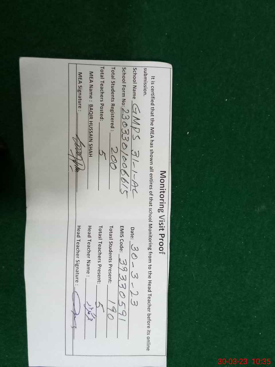 | Certified that this School was Inspected by the Undersigned MEA/DMO Today and the Information Stated Above is as Per Record. | |||||