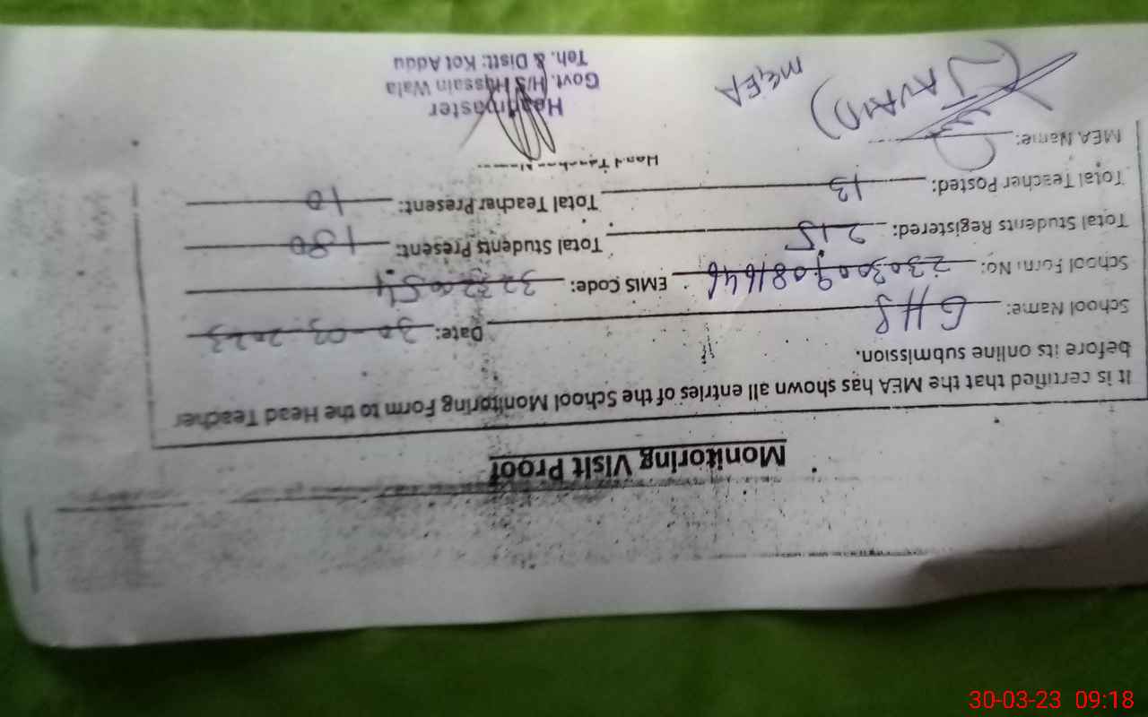 | Attendance Register | Head Teacher | MEA with School | Visit Proof |