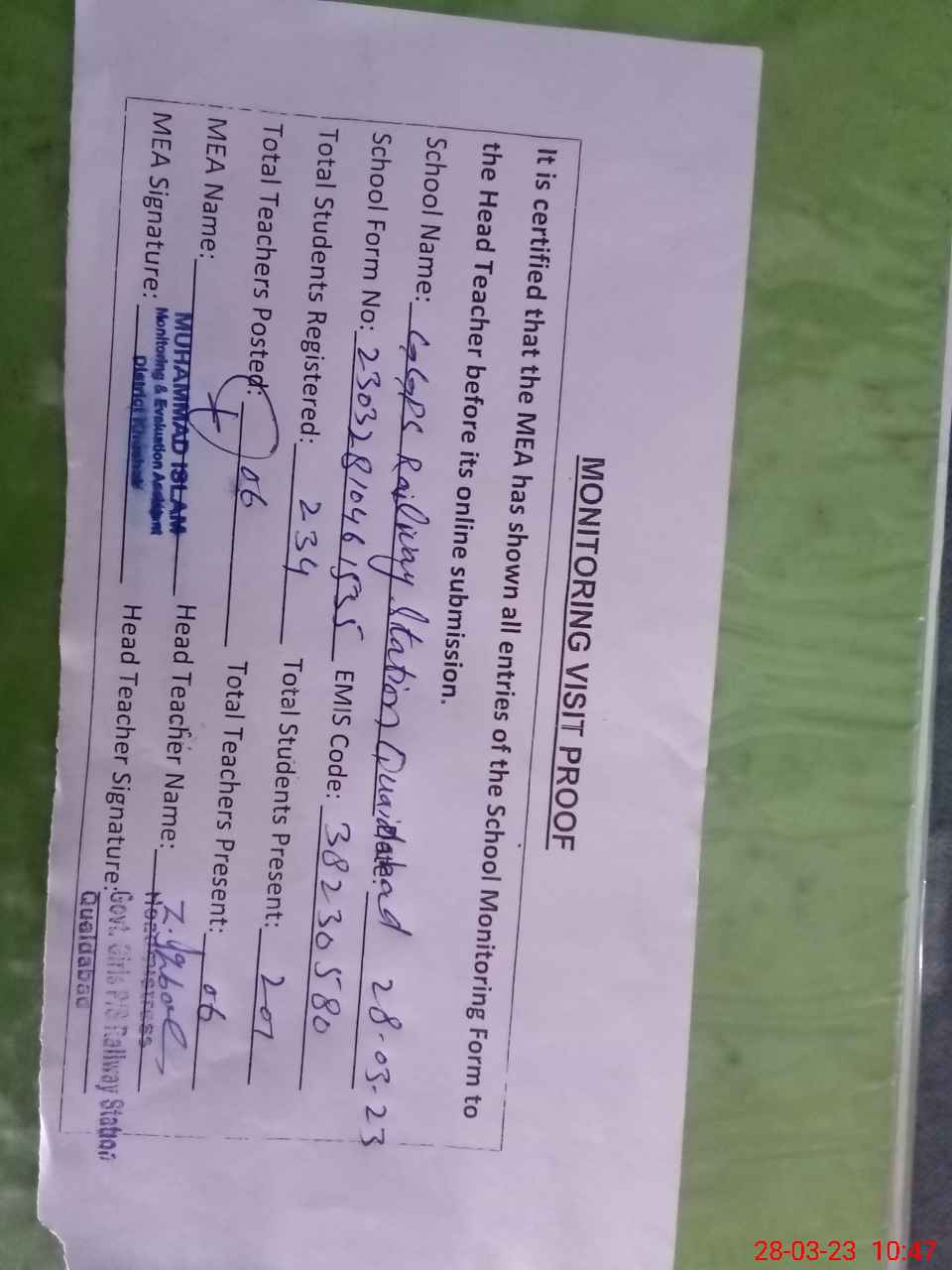 | EMIS Code: 38230580 | Name of School: GGPS RAILWAY STATION QUAIDABAD | |||