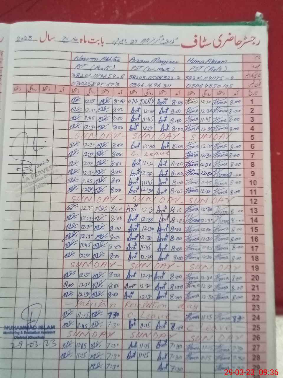 | CNIC | Full Name | Designation | R/C | Absence During Last Calender Month |