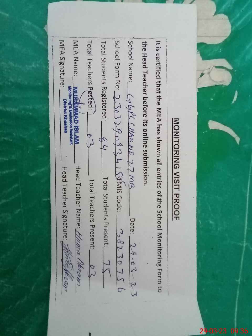 | Attendance Register | Head Teacher | MEA with School | Visit Proof |