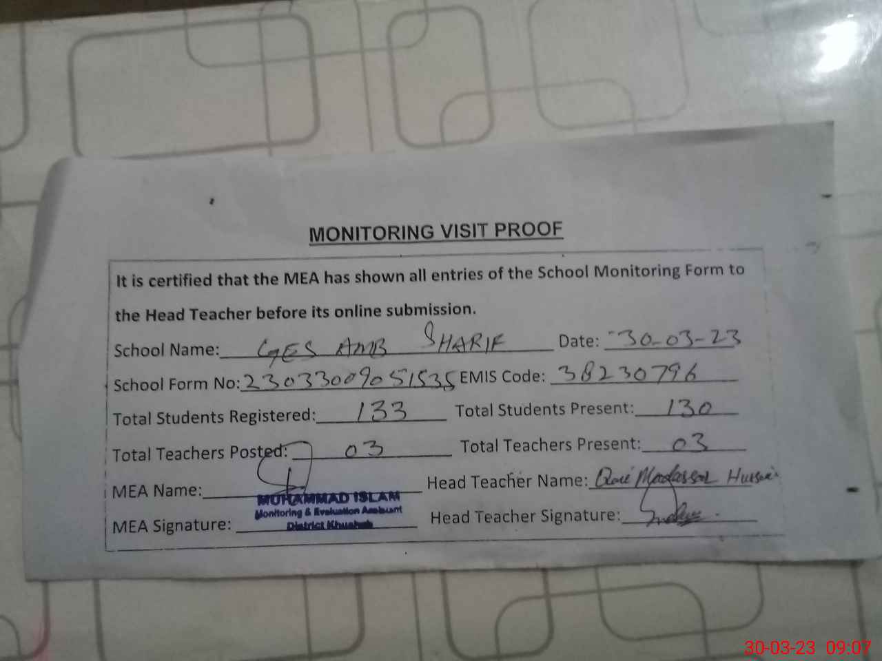 | Certified that this School was Inspected by the Undersigned MEA/DMO Today and the Information Stated Above is as Per Record. | |||||