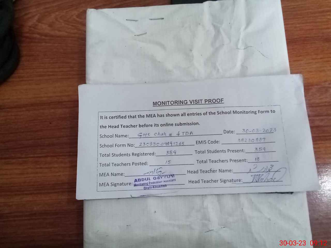 | EMIS Code: 38230837 | Name of School: GHS CHAK NO. 4 TDA | |||