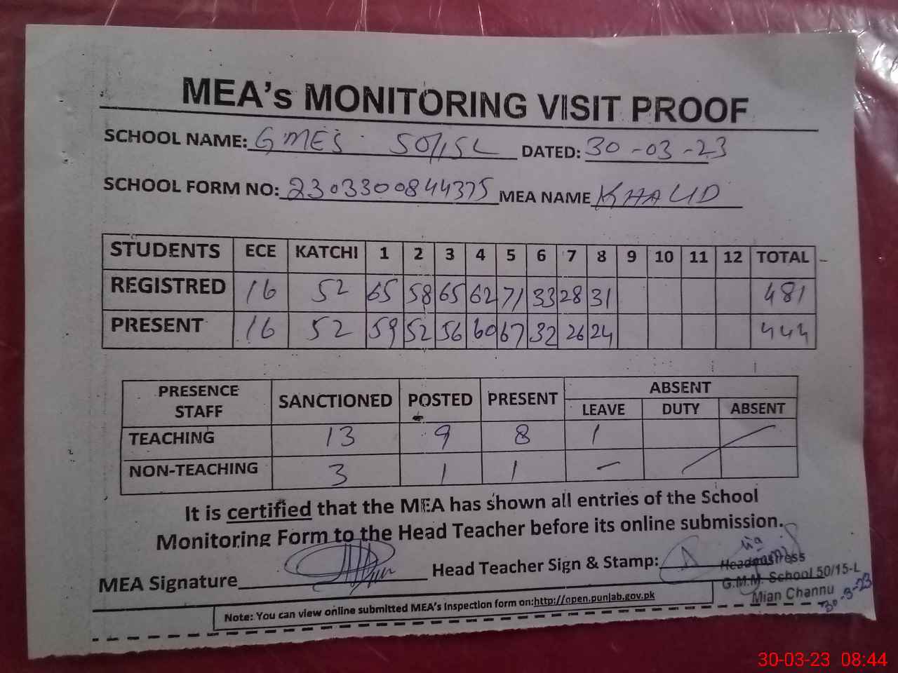 | Attendance Register | Head Teacher | MEA with School | Visit Proof |