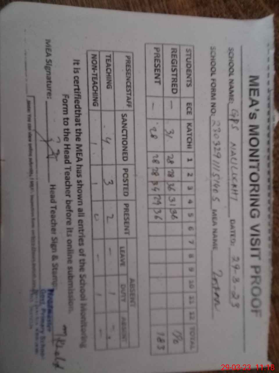 | Attendance Register | Head Teacher | MEA with School | Visit Proof |