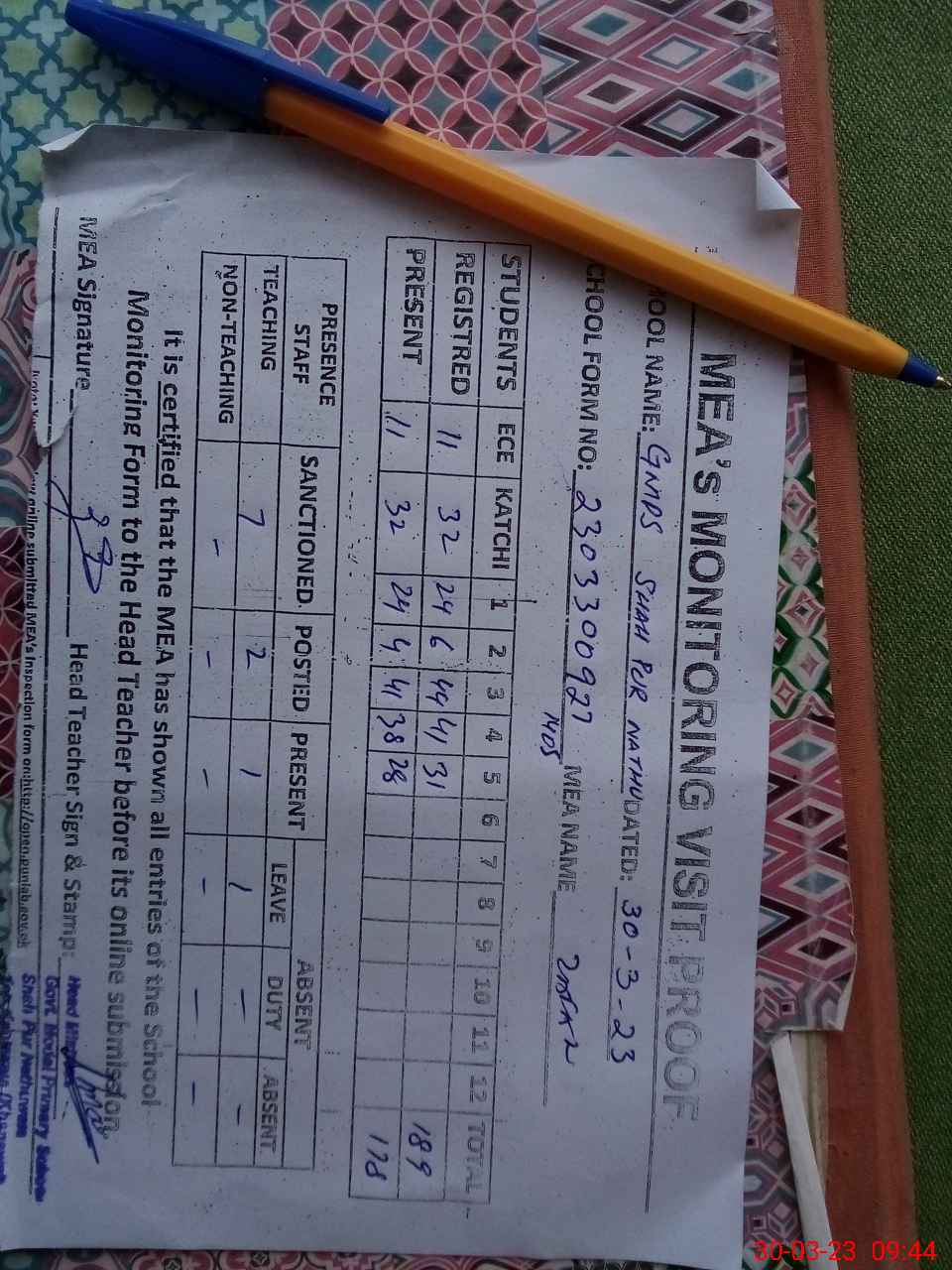 | Attendance Register | Head Teacher | MEA with School | Visit Proof |