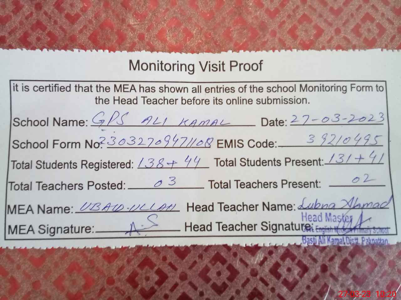 | Attendance Register | Head Teacher | MEA with School | Visit Proof |