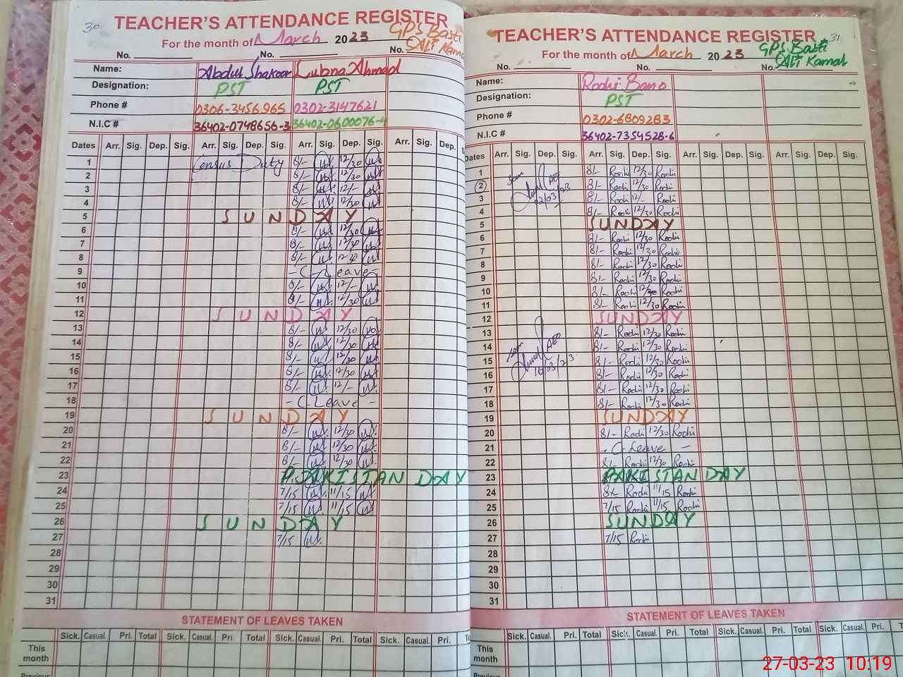 | Name: AB**** SH**** Designation: (School Headmaster's/Headmistress's) PST Phone/Cell Number: 03**** |