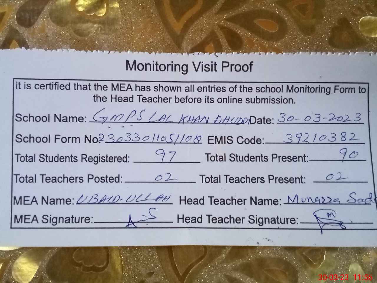 | EMIS Code: 39210382 | Name of School: GMPS LAL KHAN DHUDI | |||