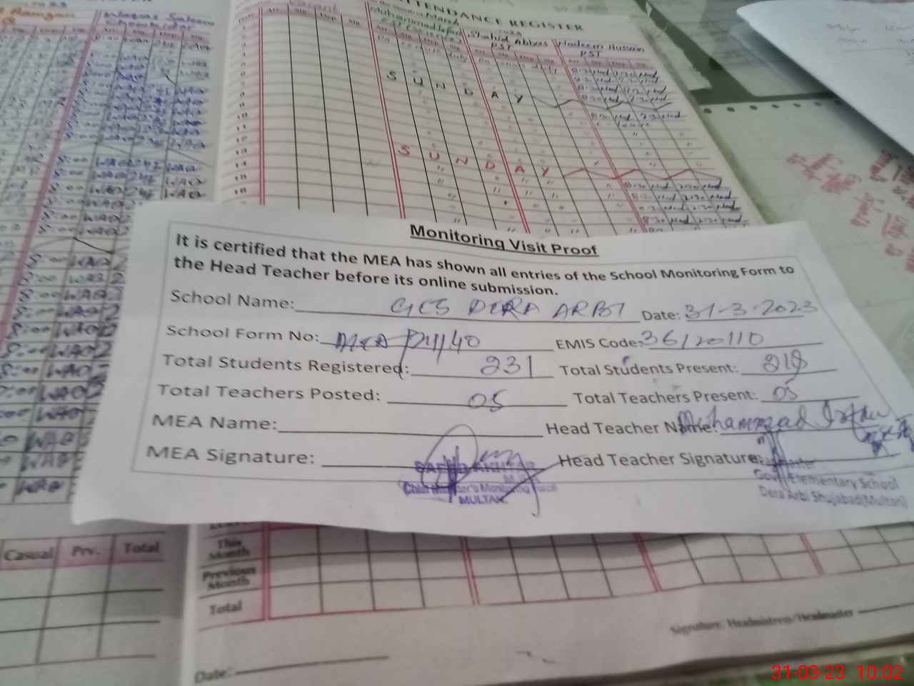 | Attendance Register | Head Teacher | MEA with School | Visit Proof |