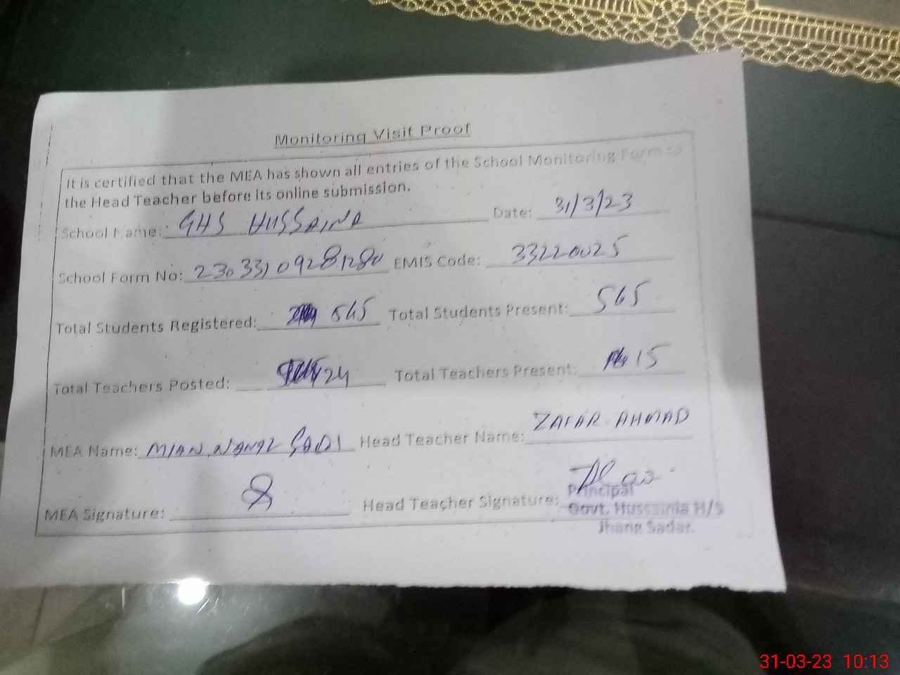 | EMIS Code: 33220025 | Name of School: GHS HUSSAINIA, JHANG | |||