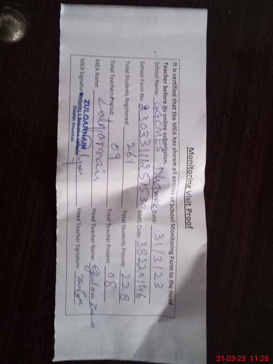 | Attendance Register | Head Teacher | MEA with School | Visit Proof |