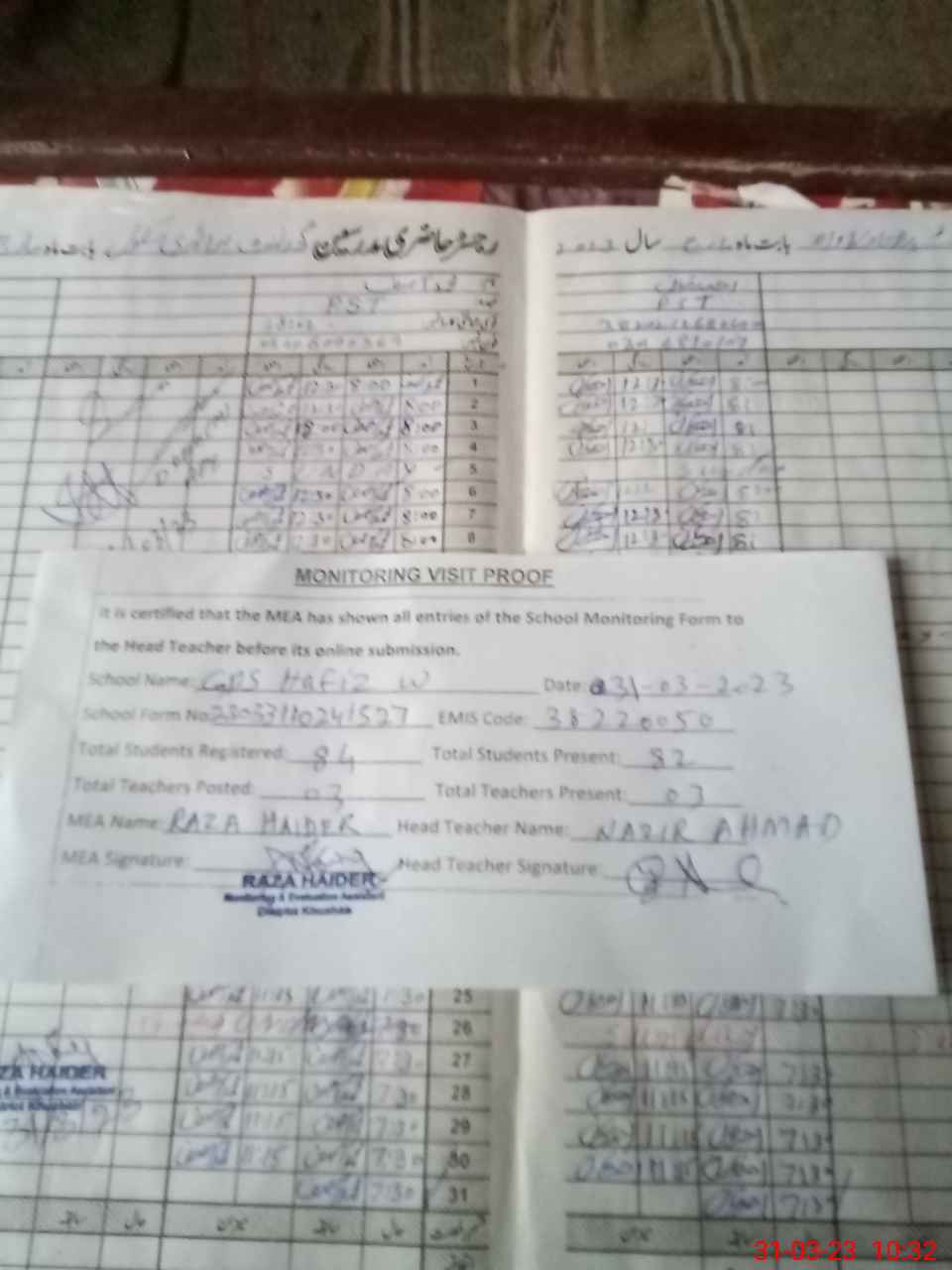 | Attendance Register | Head Teacher | MEA with School | Visit Proof |