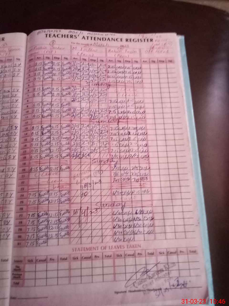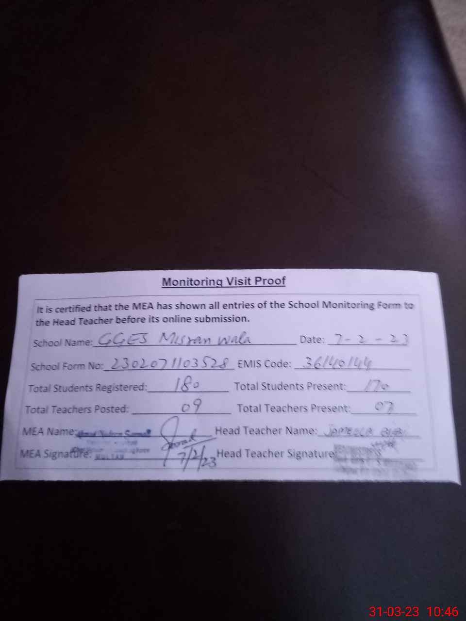 | Attendance Register | Head Teacher | MEA with School | Visit Proof |
