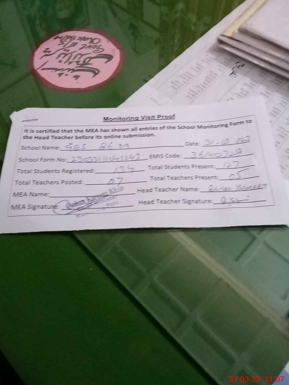 | Attendance Register | Head Teacher | MEA with School | Visit Proof |