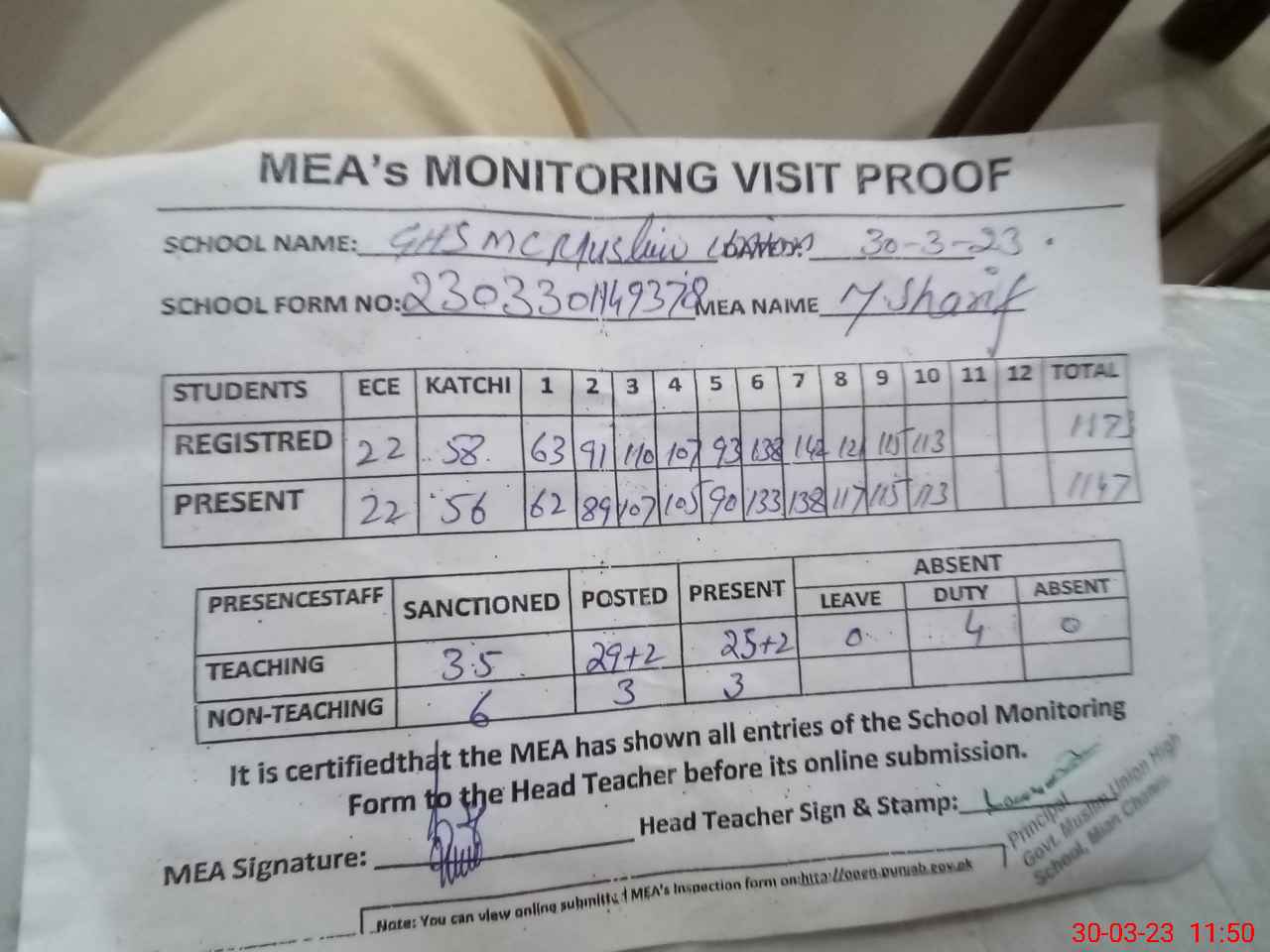 | Attendance Register | Head Teacher | MEA with School | Visit Proof |