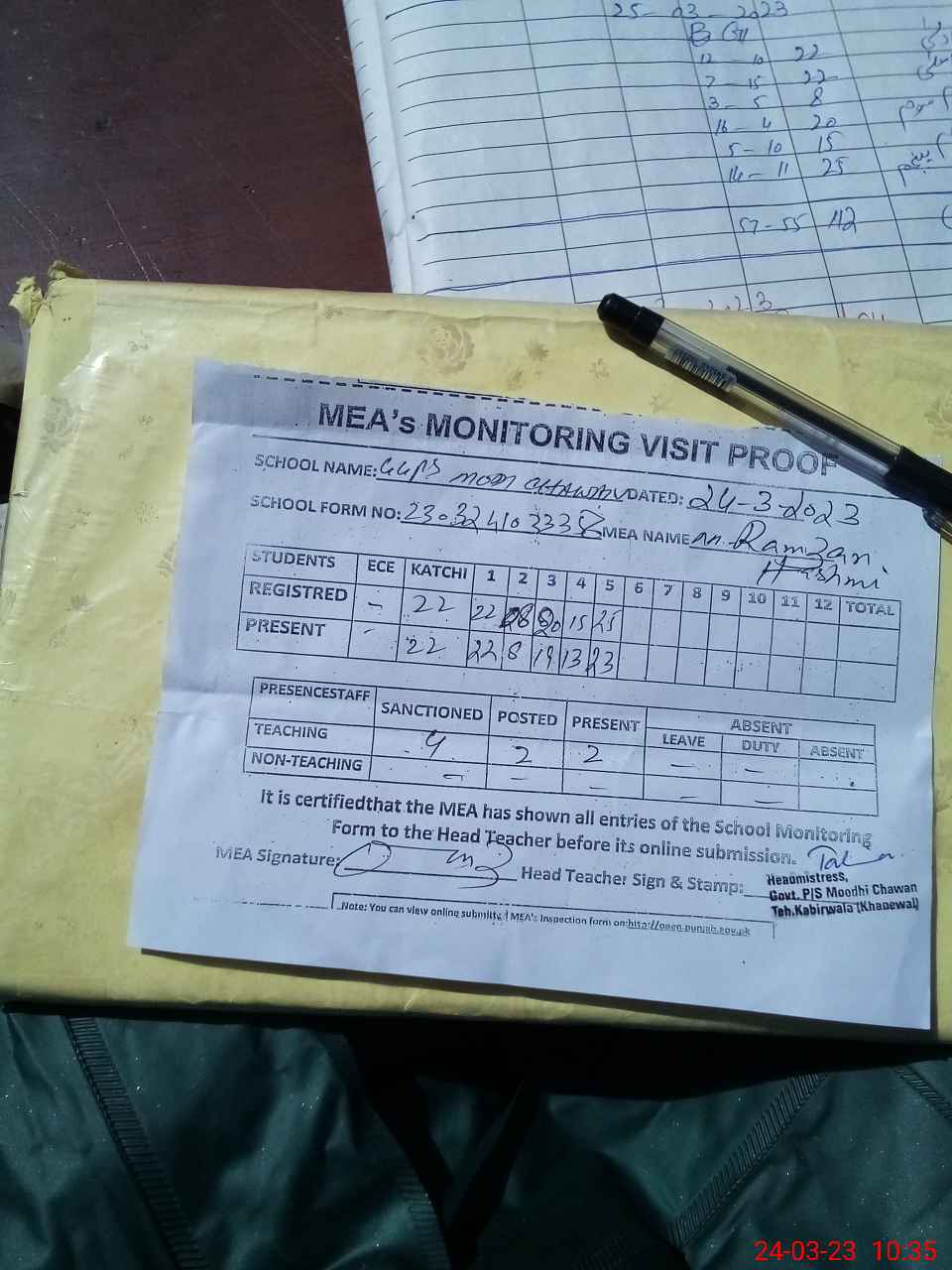 | Attendance Register | Head Teacher | MEA with School | Visit Proof |