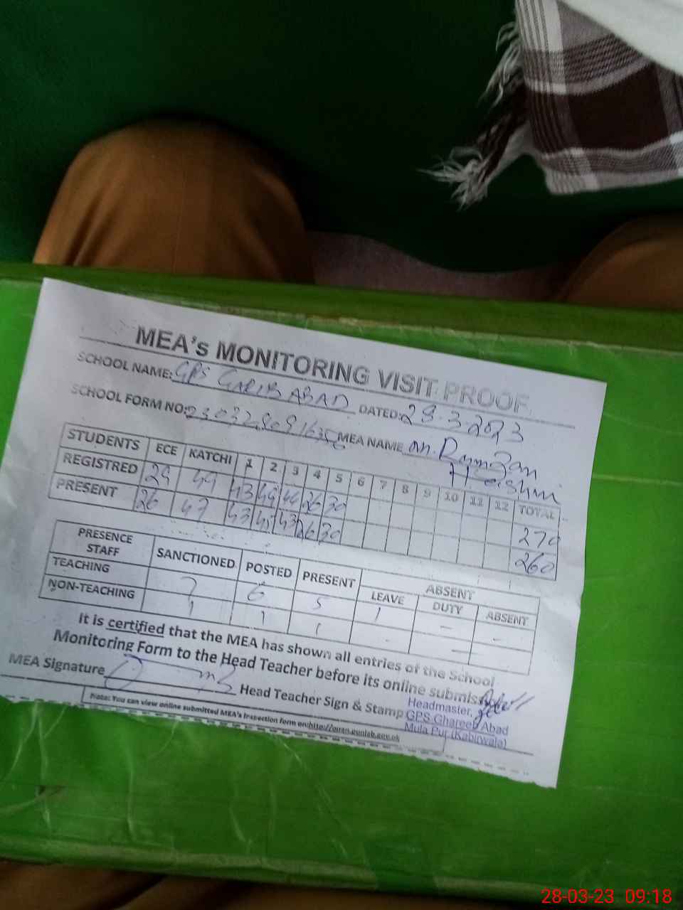 | Attendance Register | Head Teacher | MEA with School | Visit Proof |