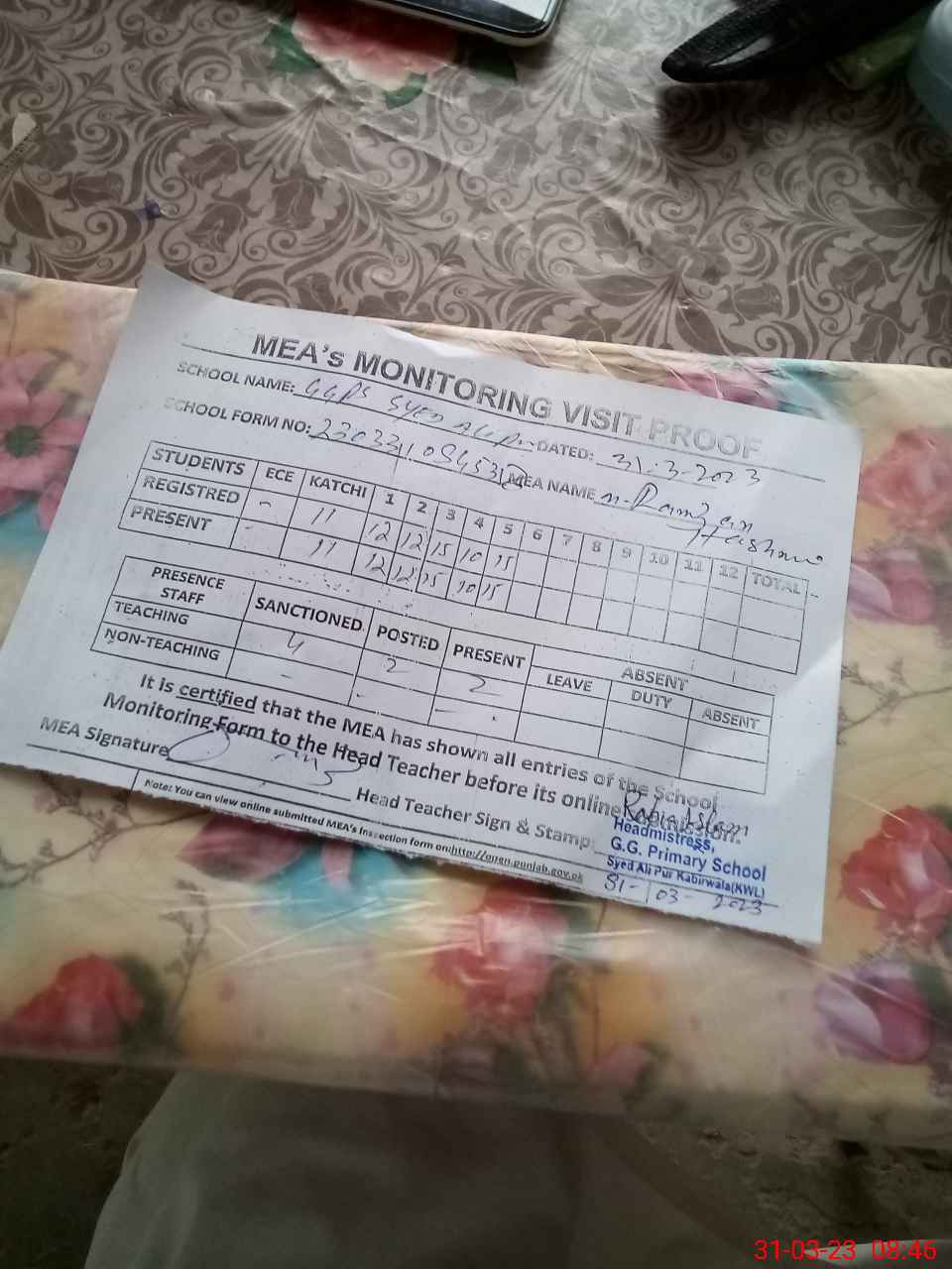 | EMIS Code: 36410347 | Name of School: GGPS SYED ALI PUR, P/O 5-KASSI, KABIRWALA | |||