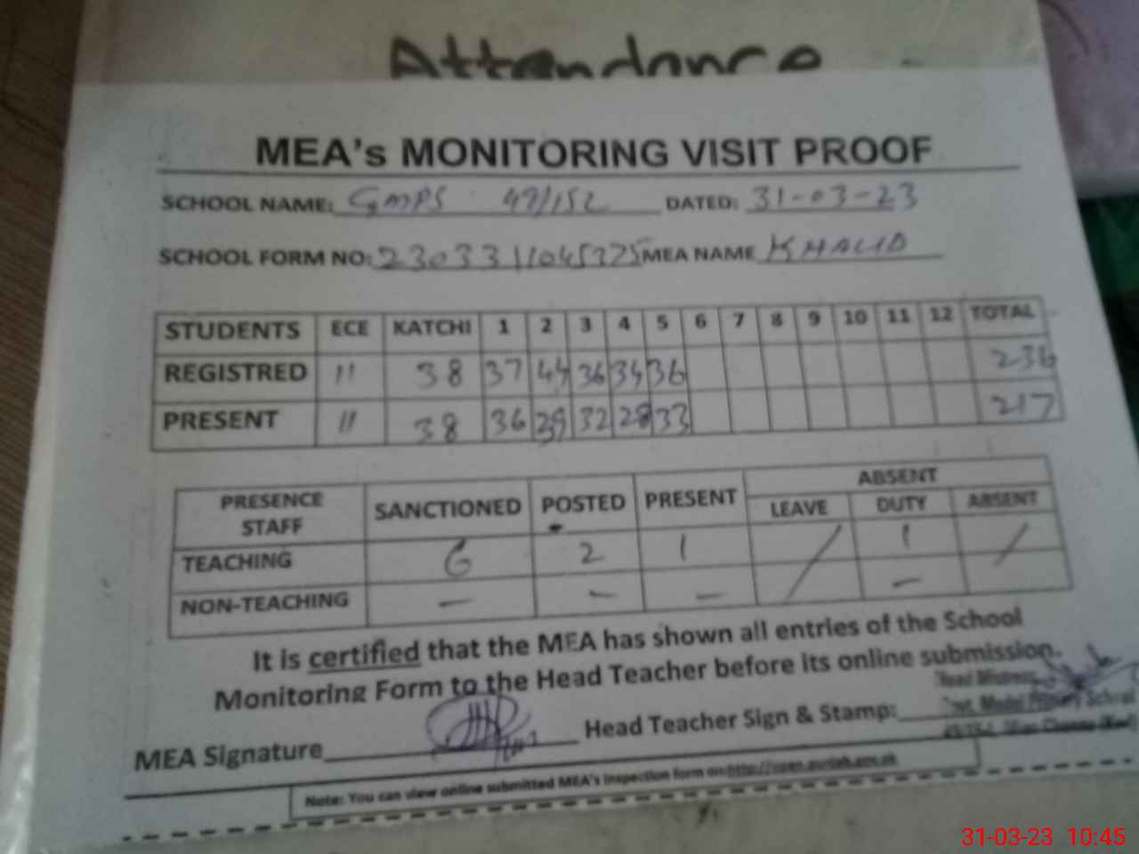 | Attendance Register | Head Teacher | MEA with School | Visit Proof |