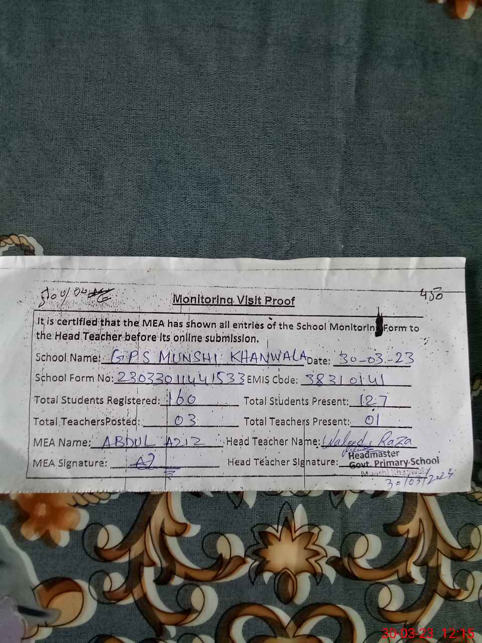 | EMIS Code: 38310141 | Name of School: GPS MUNSHI KHAN WALA JALAL PUR PO KALABAGH | |||
