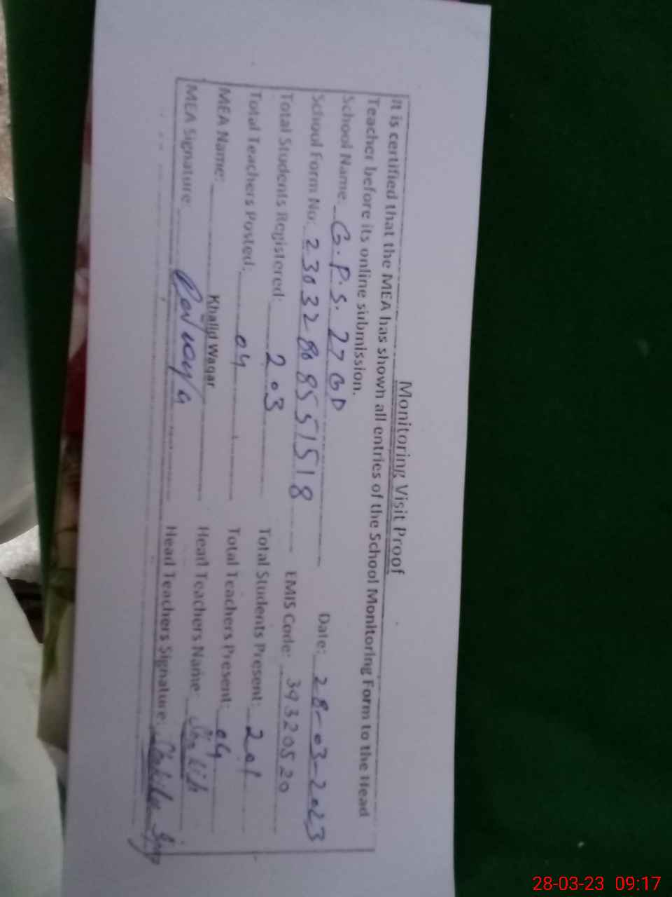 | Attendance Register | Head Teacher | MEA with School | Visit Proof |
