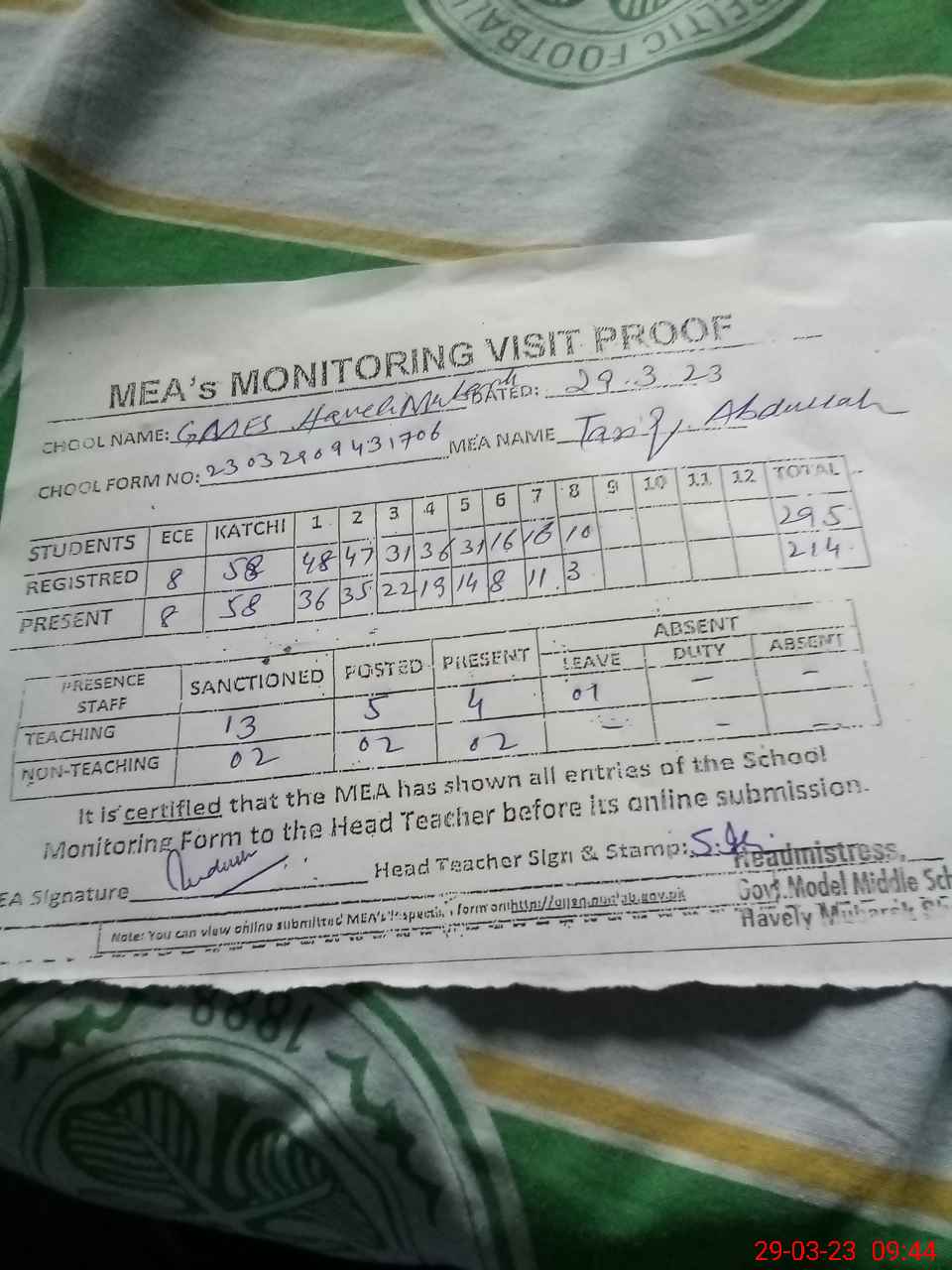 | Attendance Register | Head Teacher | MEA with School | Visit Proof |