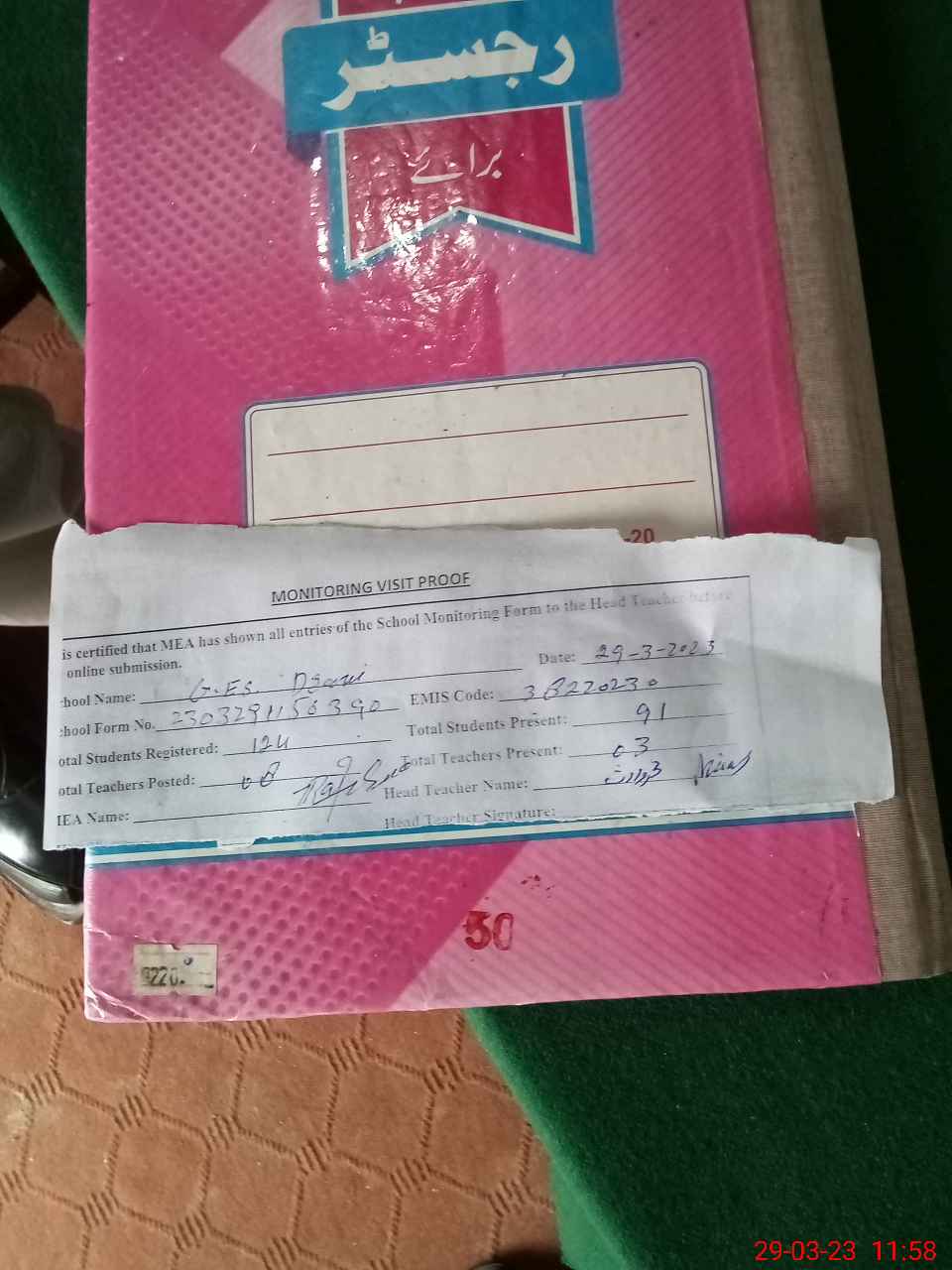 | Attendance Register | Head Teacher | MEA with School | Visit Proof |