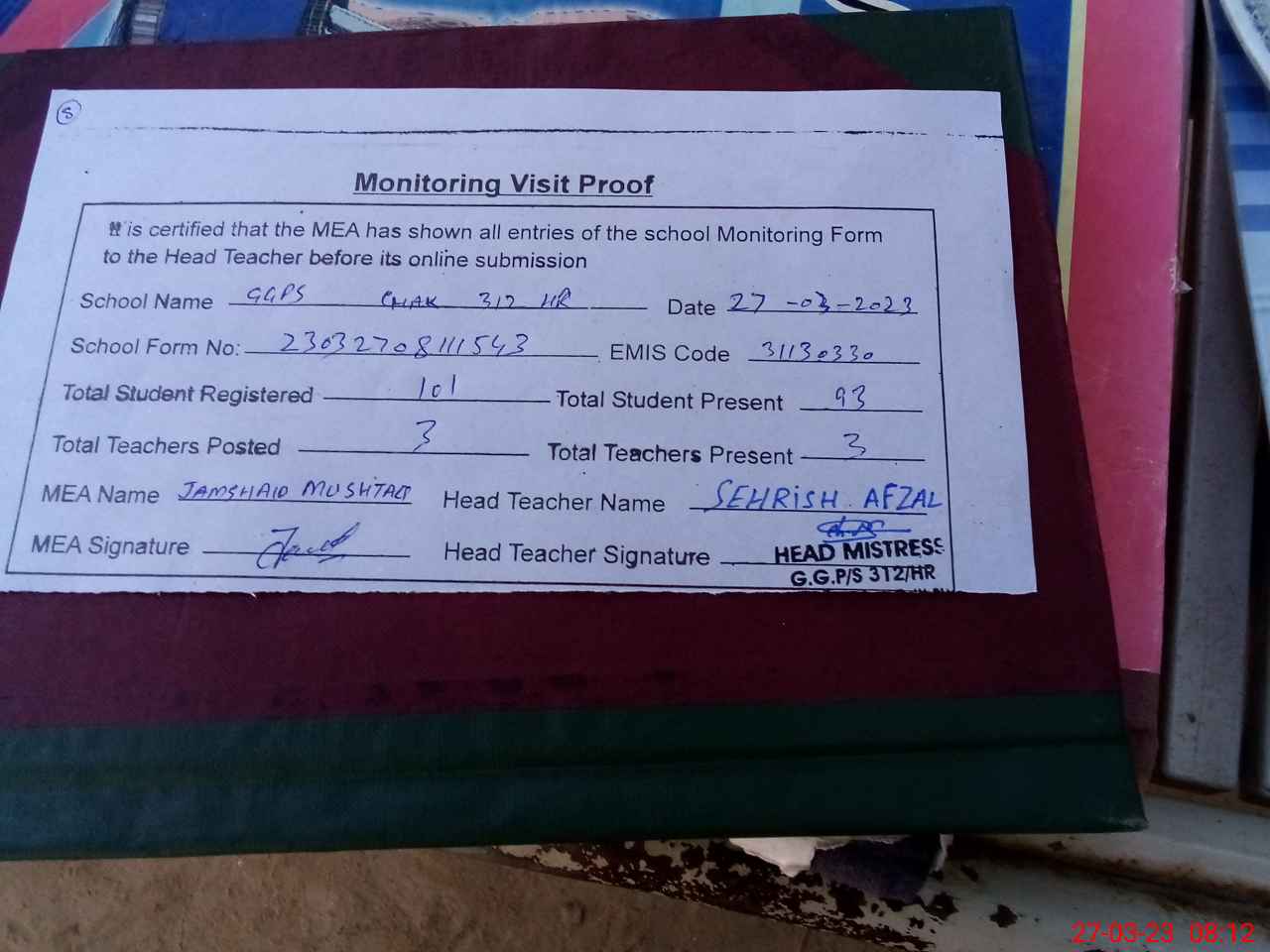 | Attendance Register | Head Teacher | MEA with School | Visit Proof |