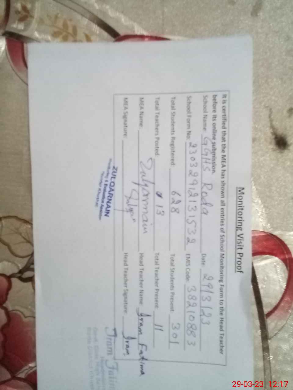 | Certified that this School was Inspected by the Undersigned MEA/DMO Today and the Information Stated Above is as Per Record. | |||||