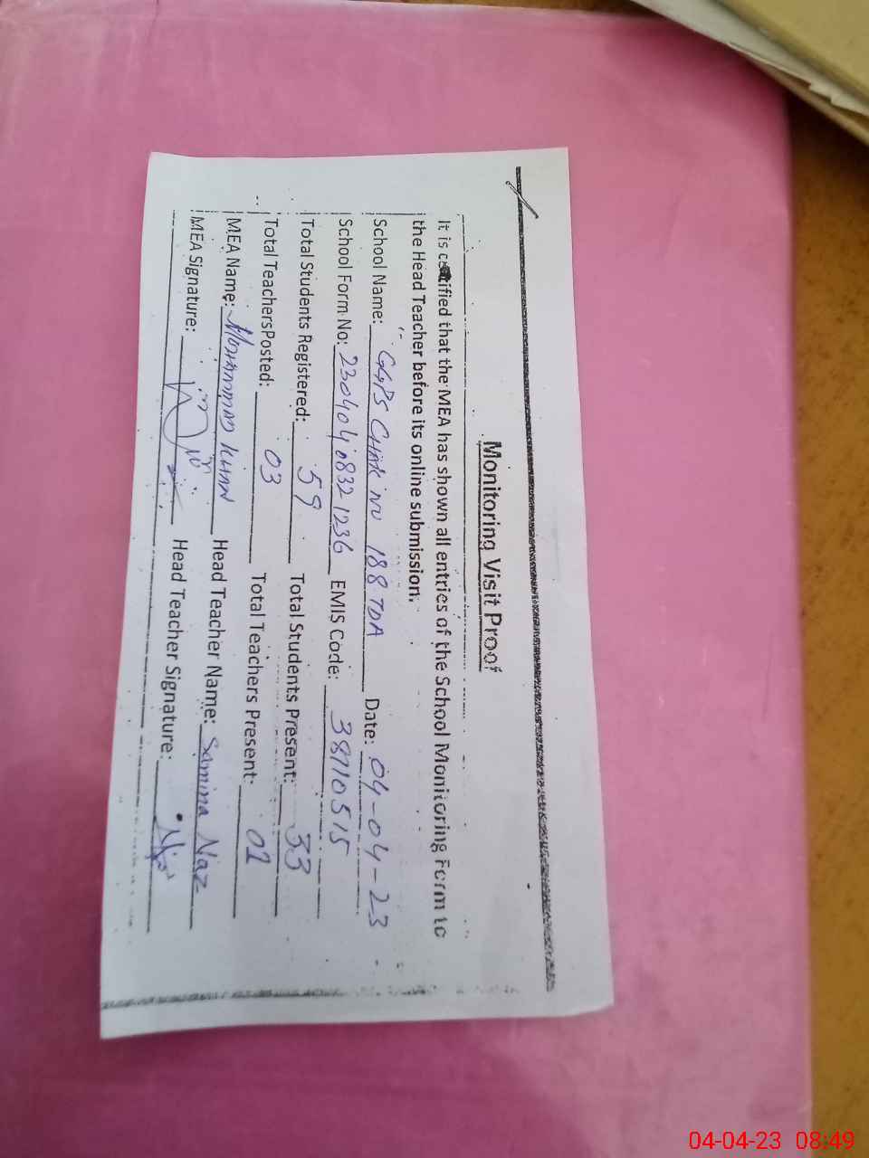 | Attendance Register | Head Teacher | MEA with School | Visit Proof |