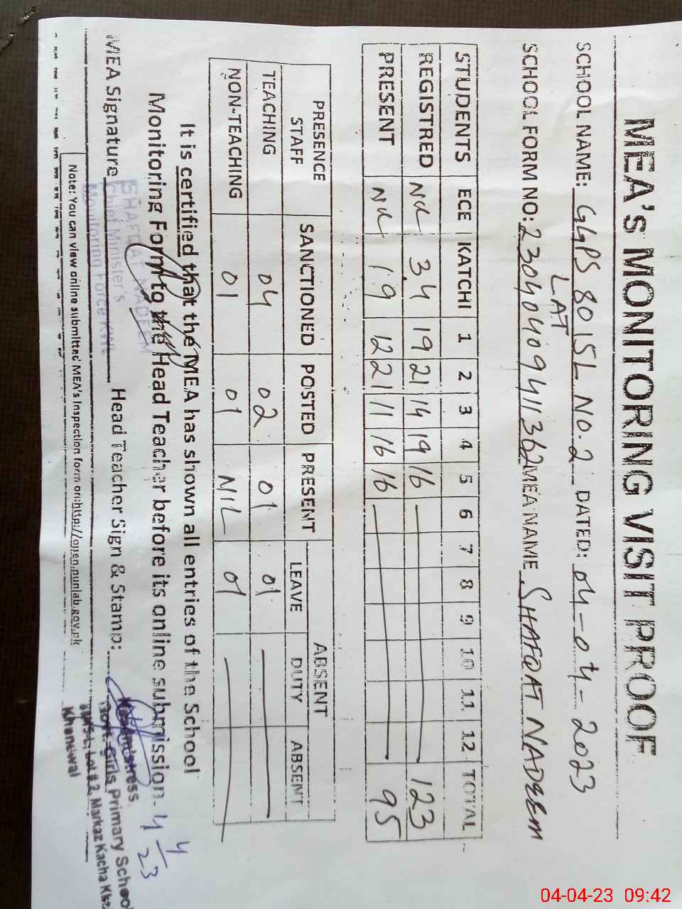 | Attendance Register | Head Teacher | MEA with School | Visit Proof |