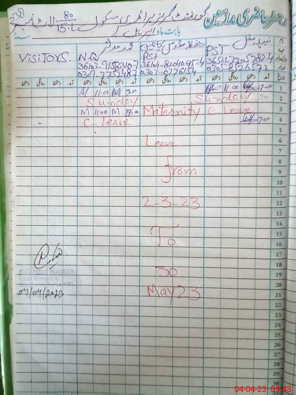 | Name: NA**** MU**** Designation: (School Headmaster's/Headmistress's) PST Phone/Cell Number: 03**** |