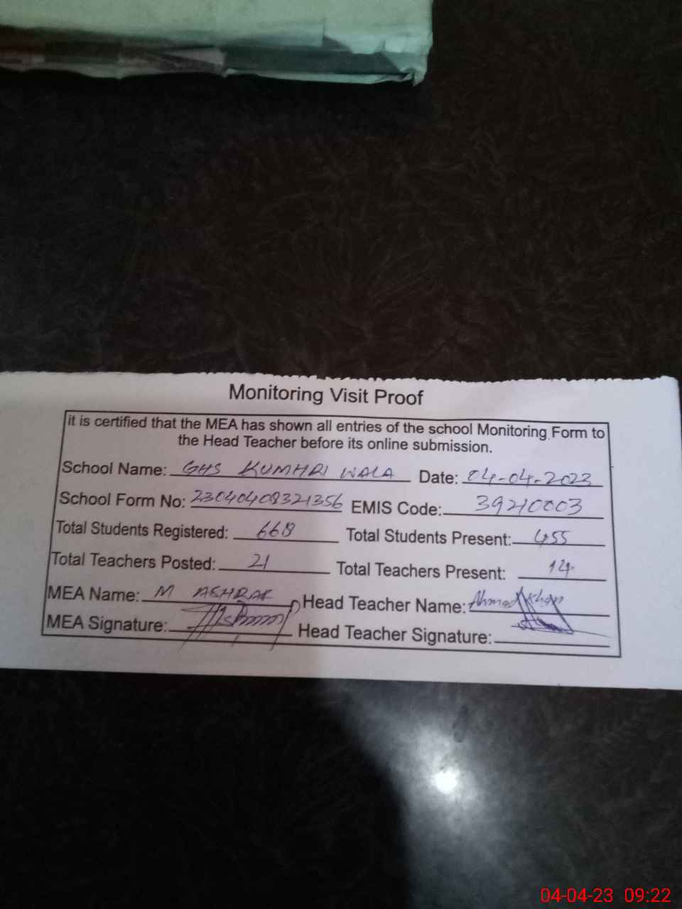 | Attendance Register | Head Teacher | MEA with School | Visit Proof |