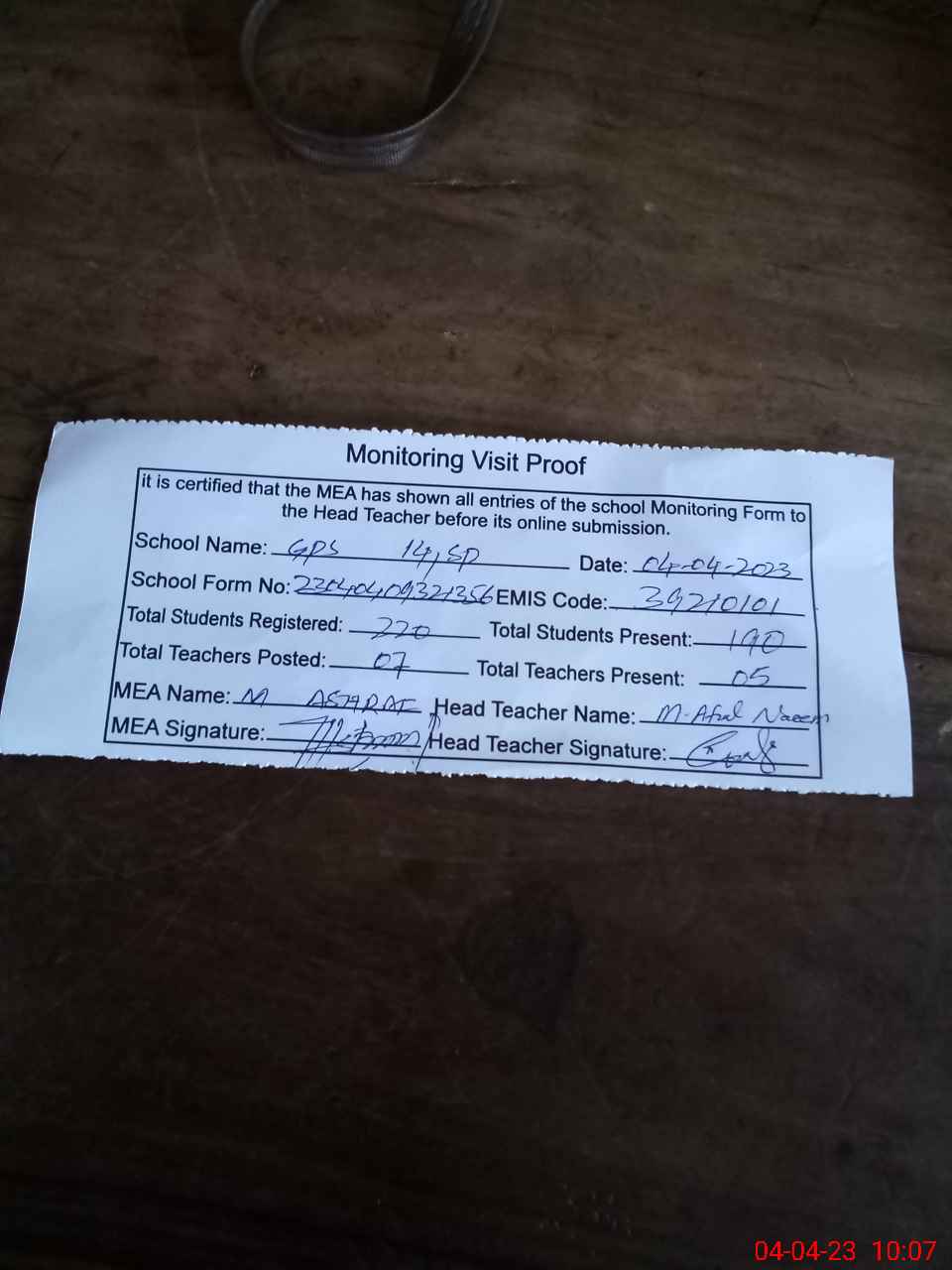 | EMIS Code: 39210101 | Name of School: GPS 14-SP P.O PAKPATTAN | |||