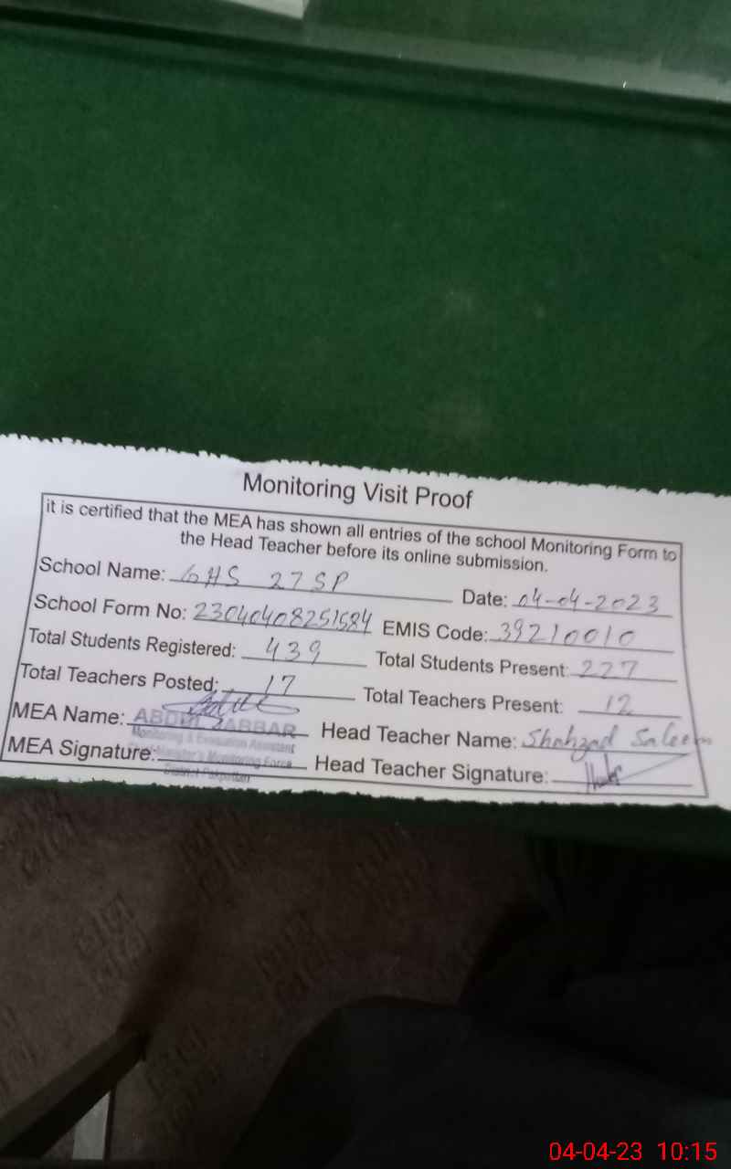 | EMIS Code: 39210010 | Name of School: GHS 27 SP | |||
